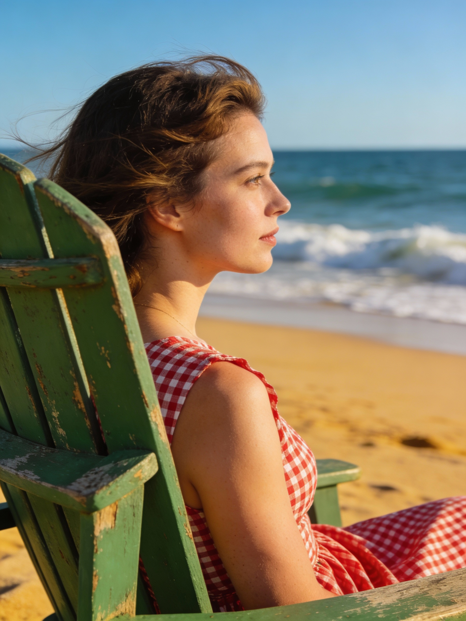 3 versions. A candid close-up profile portrait photograph of a woman wearing a classic red and white gingham dress, gracefully seated in a weathered green Adirondack chair on a sandy beach. She gazes out towards the vast ocean, with gentle waves gently rolling onto the shore behind her, wind blowing her hair .The sky is a clear, contrasting with the vibrant colors of her dress and the soft, golden sand. The sunlight creates a warm, inviting atmosphere, accentuating the relaxed and peaceful mood of the scene. Photo realism.