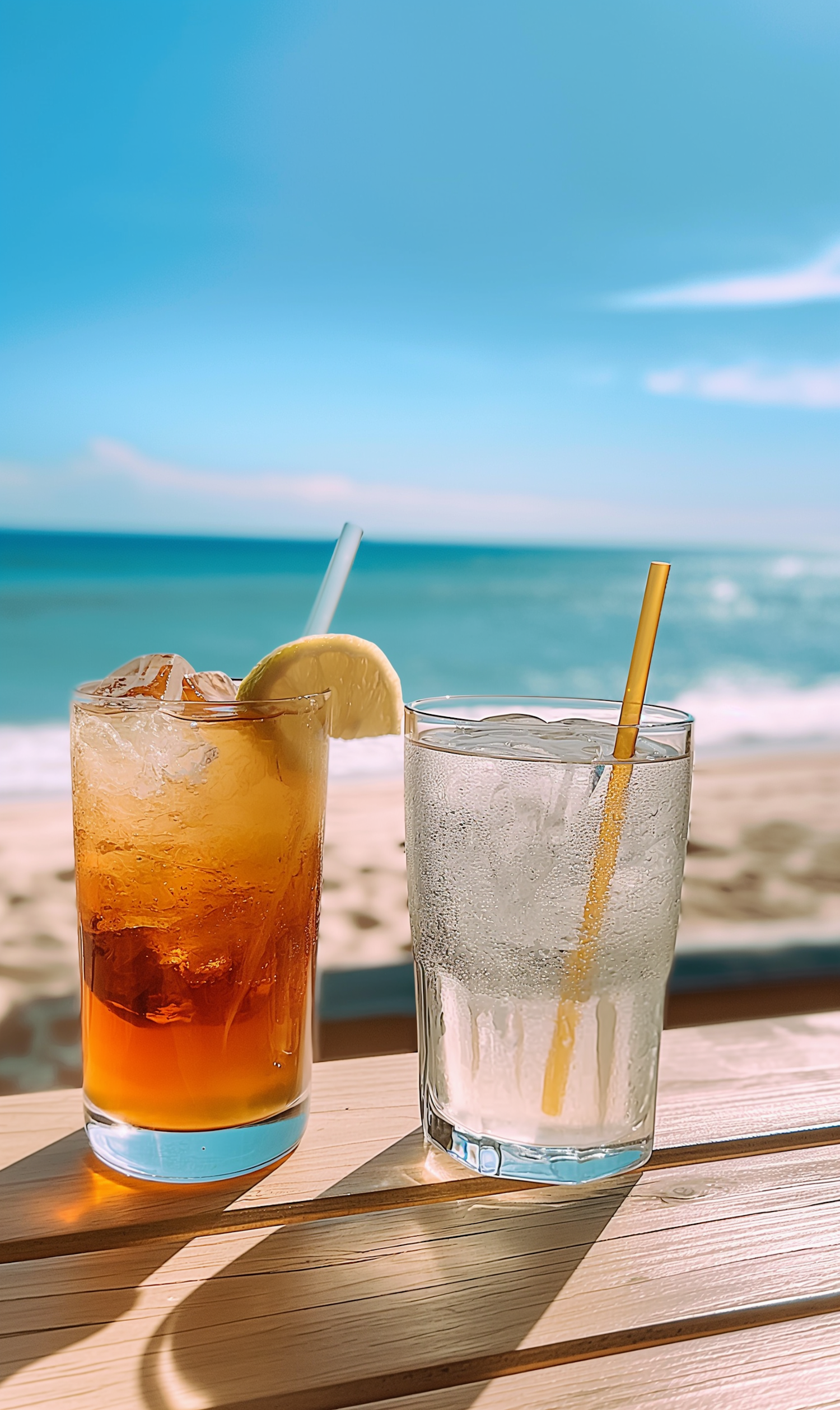 Two refreshing drinks on a beachside table, with a clear blue sky and ocean waves in the background.