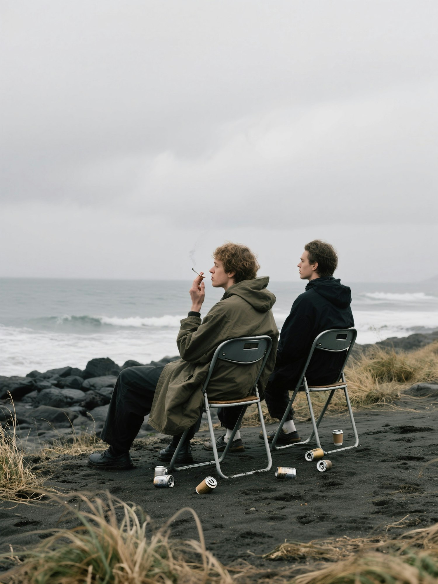 Two people sit on folding chairs by a rocky beach, one smoking, with scattered cans around, under an overcast sky.