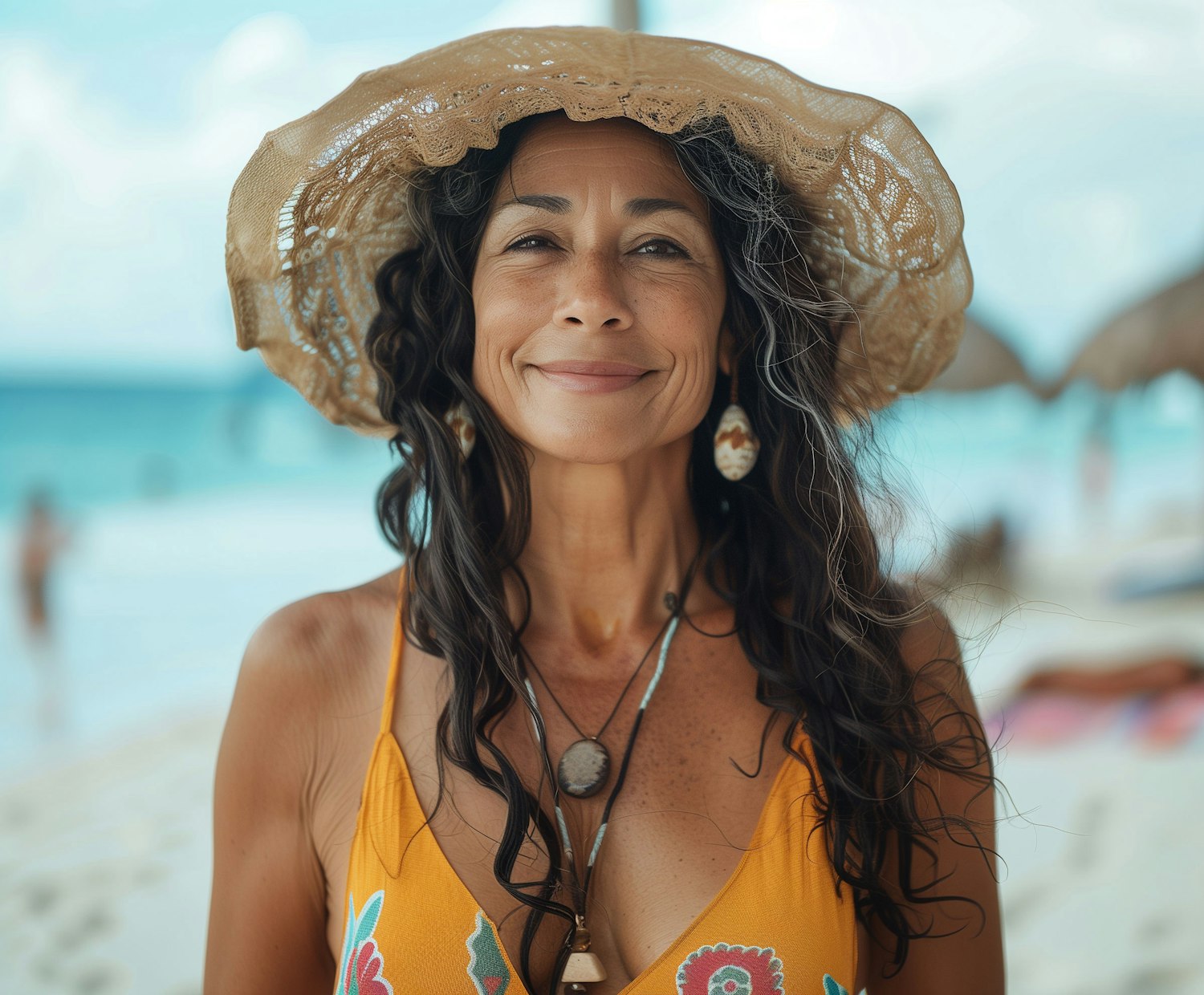 Smiling woman in a straw hat and yellow swimsuit on a sunny beach, exuding a relaxed and bohemian vibe.