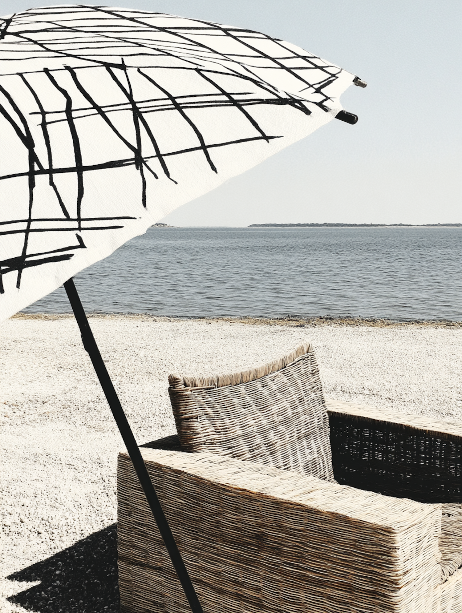 Relaxing beach setup with a wicker chair and a stylish umbrella featuring bold black patterns, overlooking calm waters.