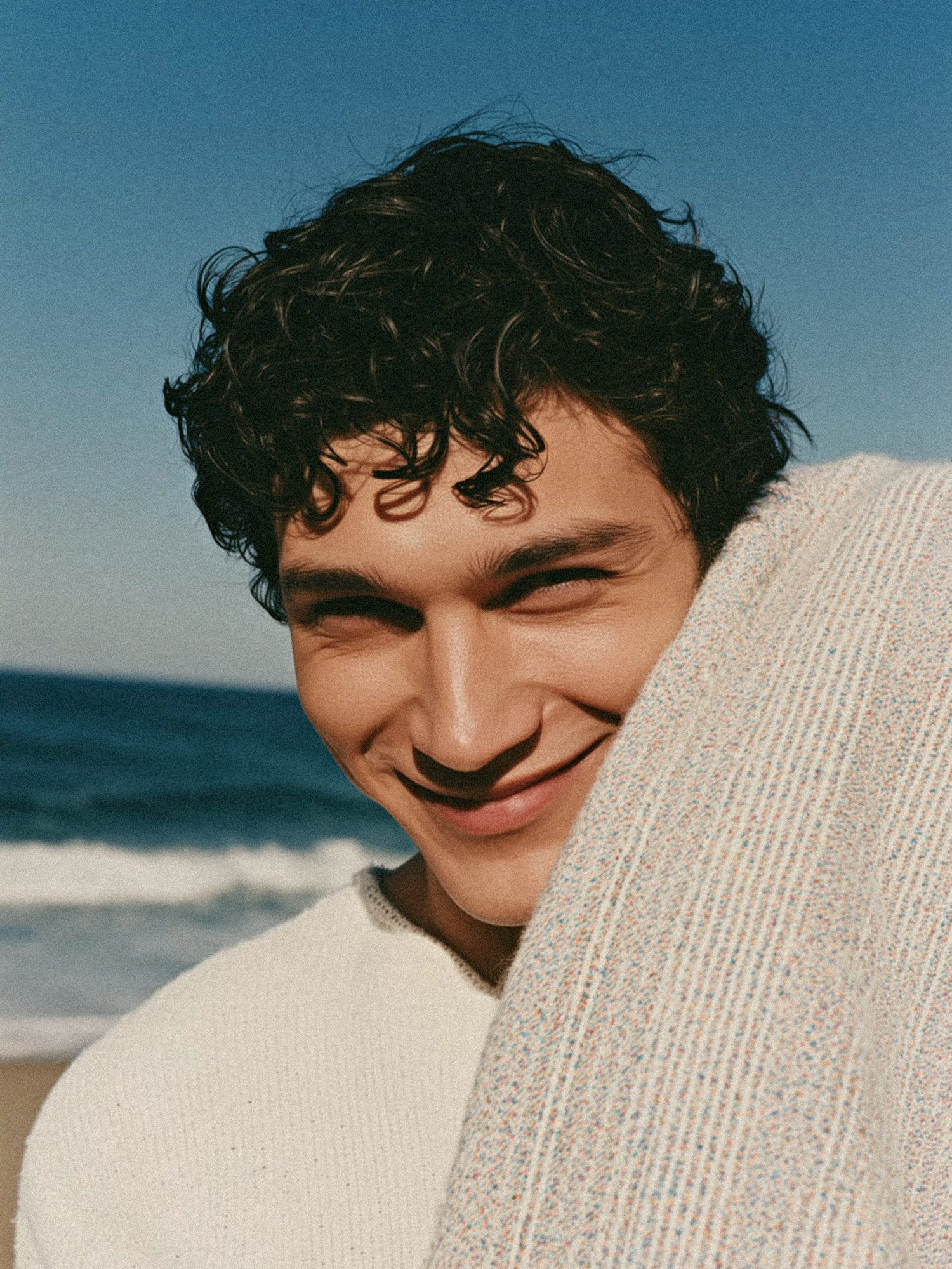 A young man with curly hair smiles warmly at the beach, wearing a light sweater with the ocean and sky in the background.