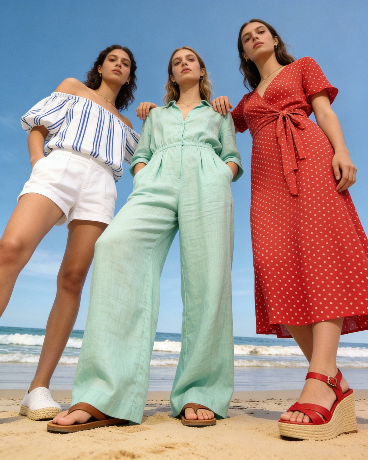 Three women in stylish summer outfits pose on a sunny beach, showcasing vibrant fashion against a serene ocean backdrop.