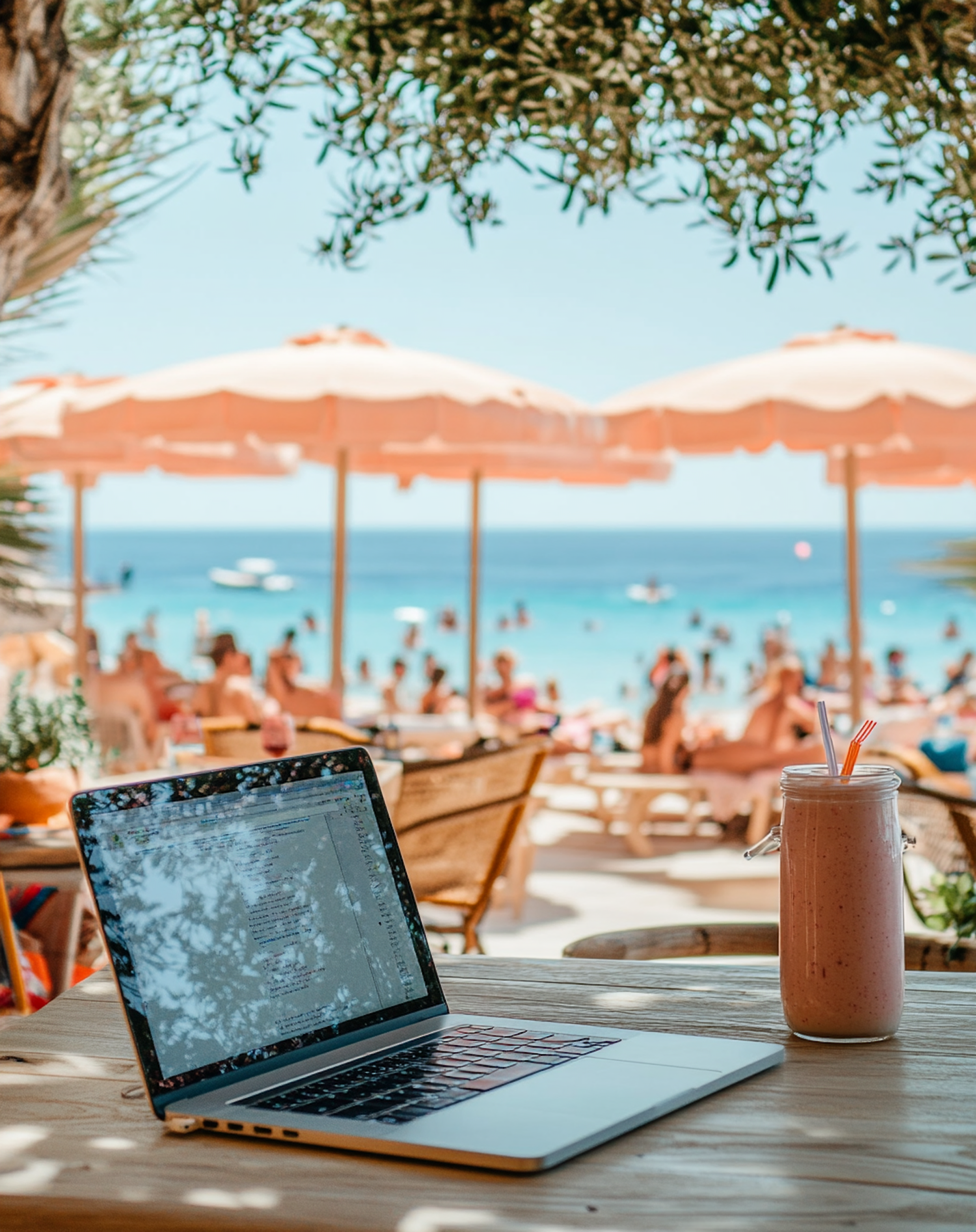 A laptop and smoothie on a table with a sunny beach and umbrellas in the background, perfect for a workcation vibe.