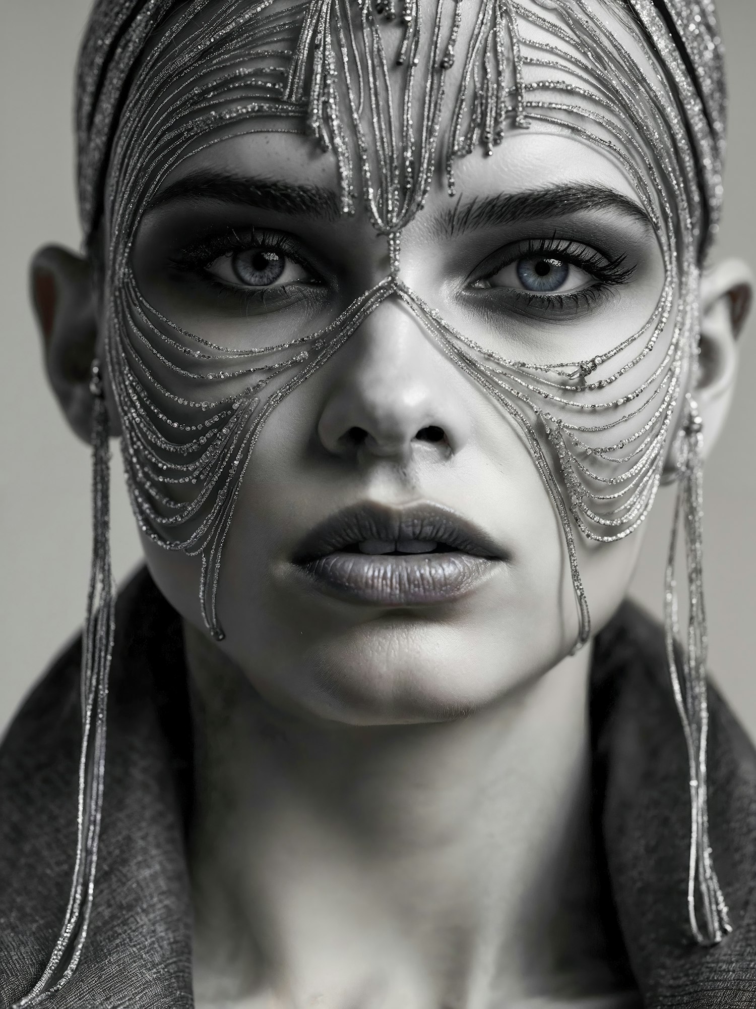 A captivating portrait of a woman with a detailed metallic mask, highlighting her blue eyes and fair skin.