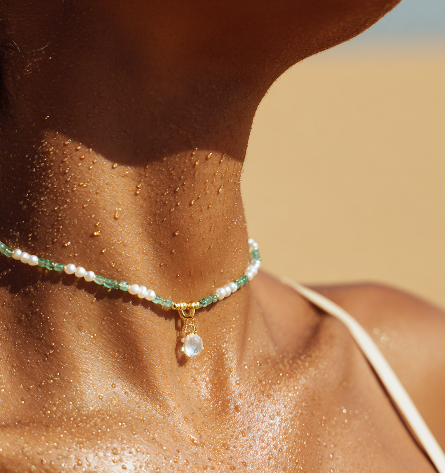 Close-up of a beaded necklace with a pendant on a glistening neck, set against a warm, sandy background.