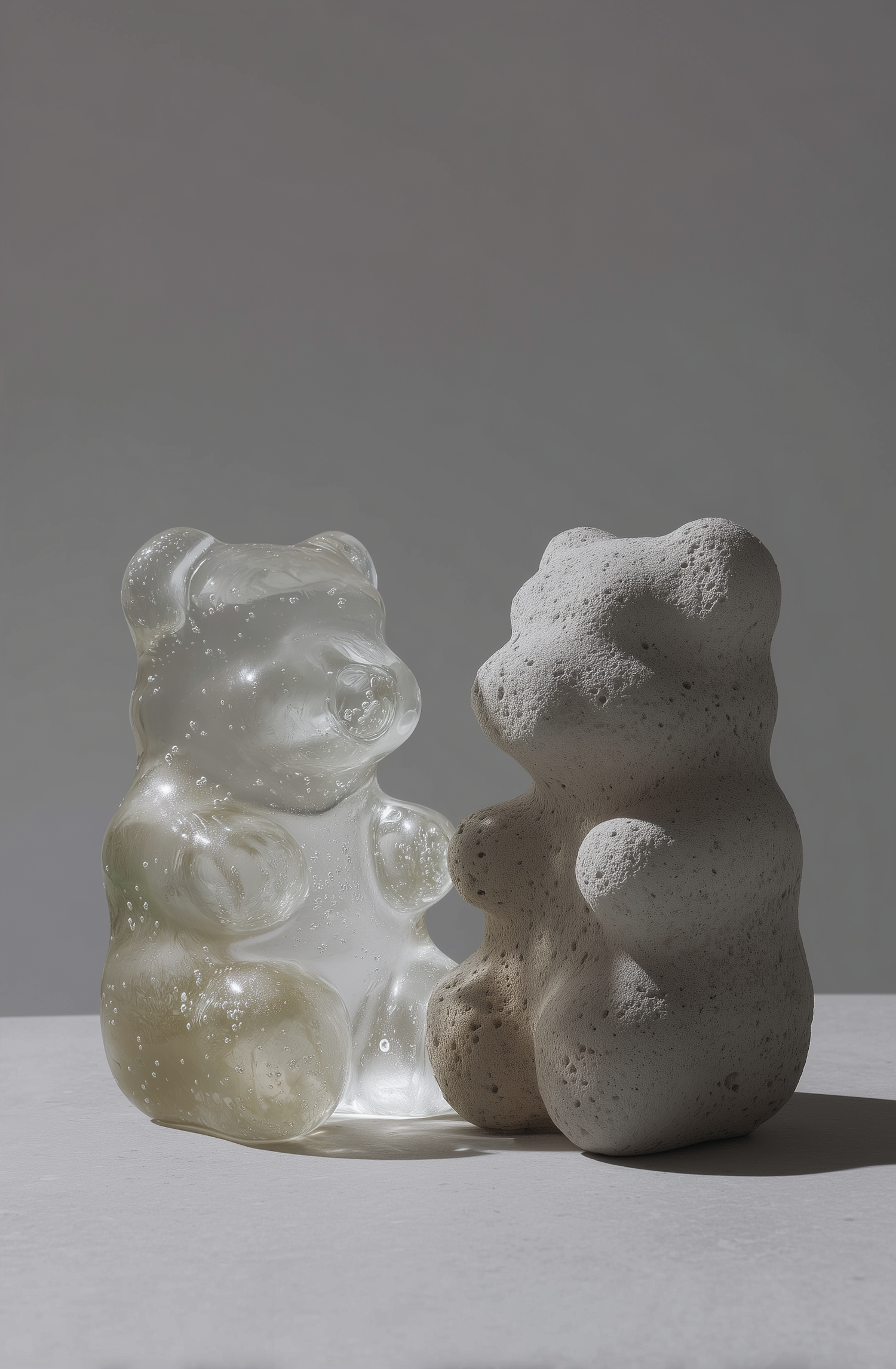 Two bear-shaped sculptures, one transparent with bubbles and the other textured and matte, placed on a neutral surface with soft lighting.