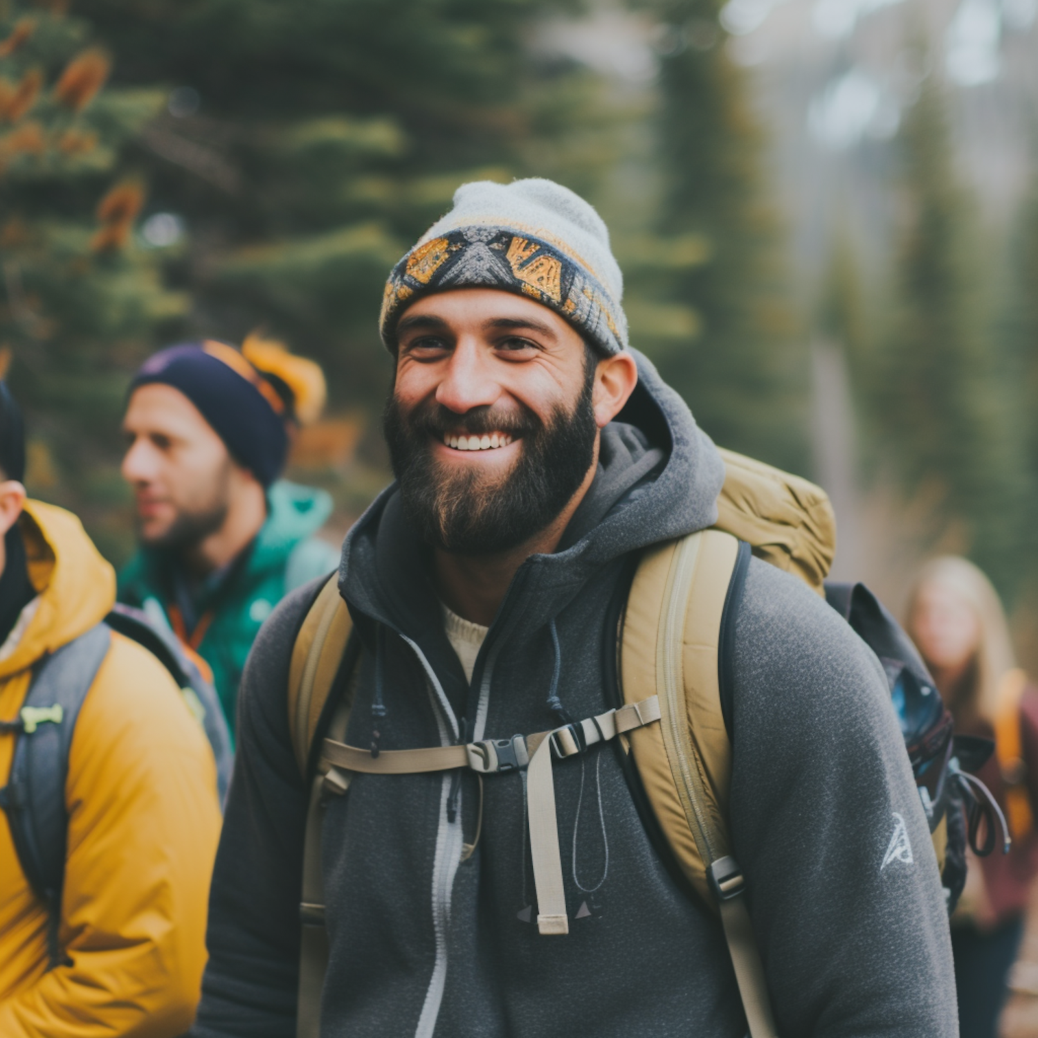 Smiling bearded man in hiking gear with a tan backpack, surrounded by hikers in a forested area with tall evergreen trees.