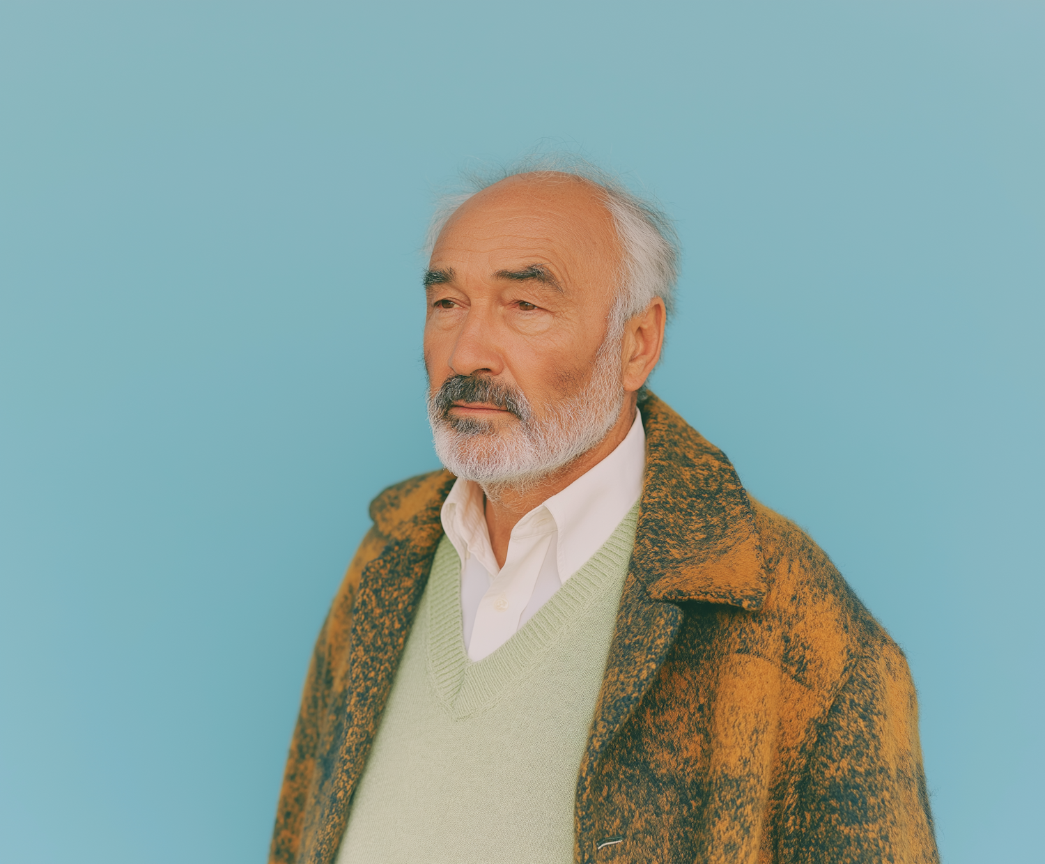 Handsome older man wearing a patterned coat and pastel sweater against a blue background, exuding a calm and thoughtful presence.