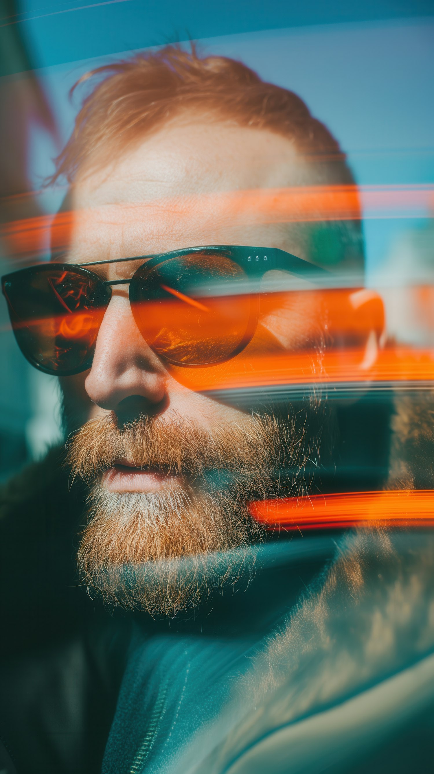 Close-up of a bearded man in sunglasses with orange light streaks, creating a dynamic and artistic vibe.