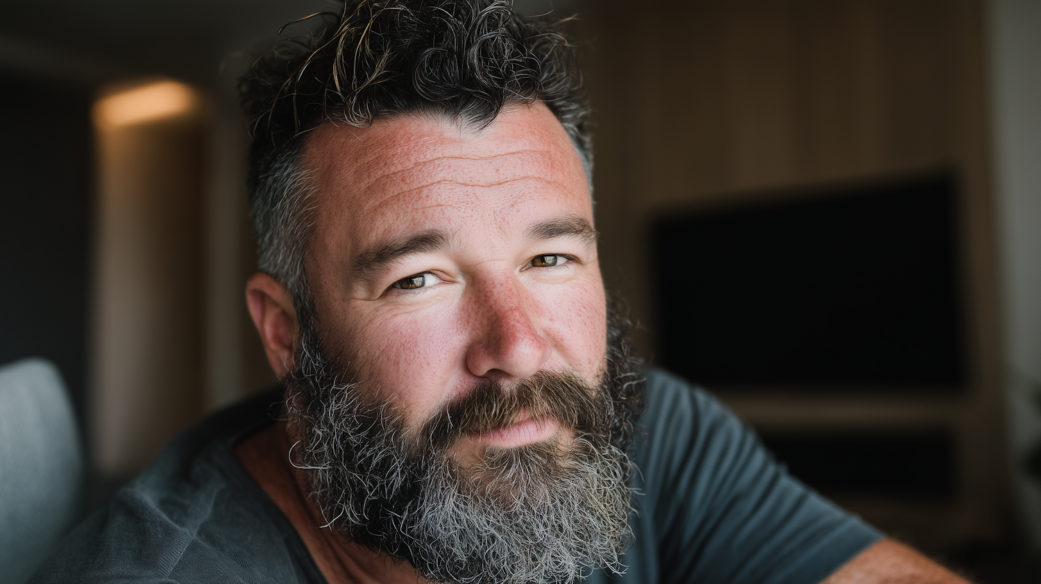 A bearded man with wavy hair and a calm expression, captured in warm indoor lighting with a softly blurred background.