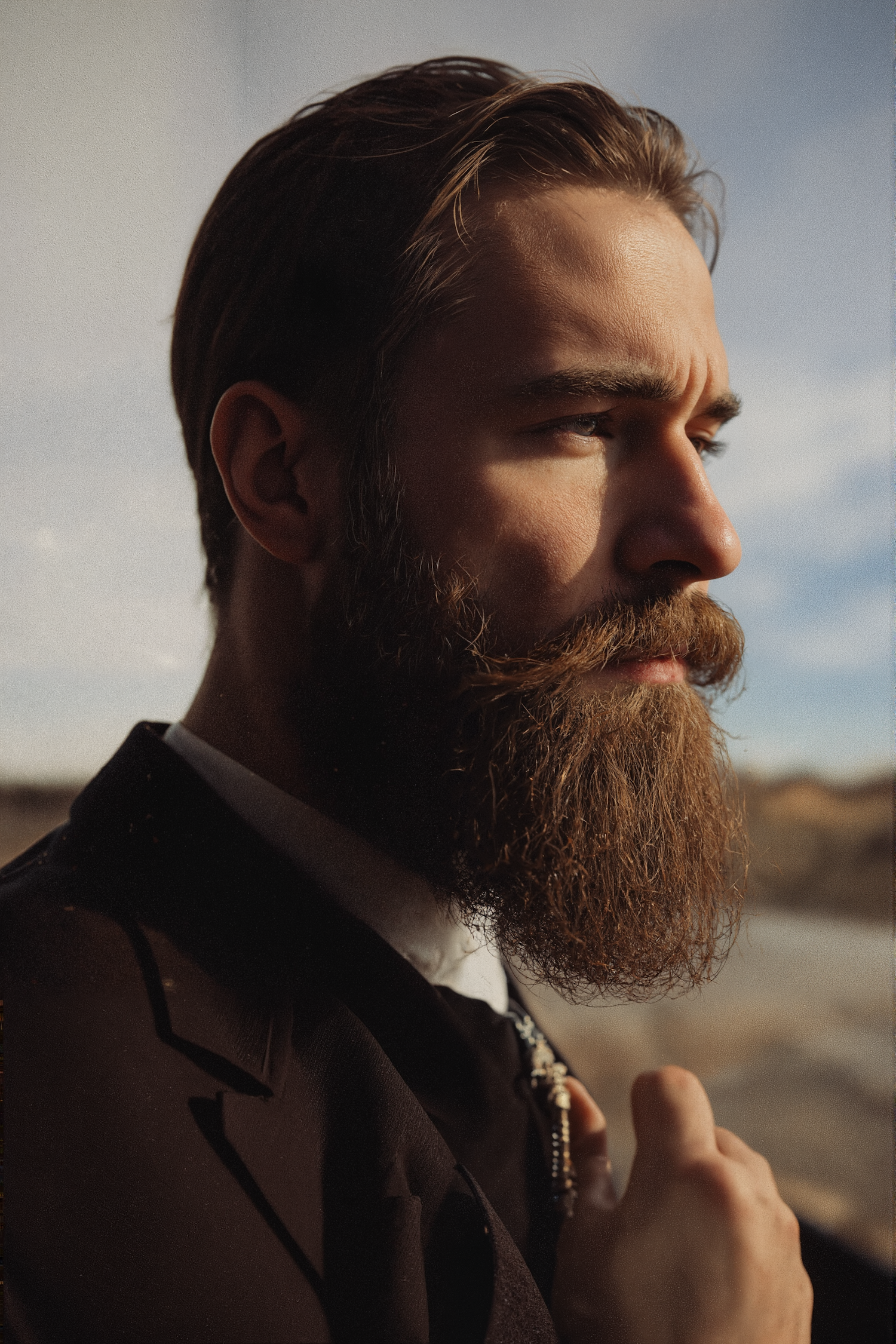 Close-up of a bearded man in a formal suit gazing into the distance under warm natural light, with a blurred outdoor background.