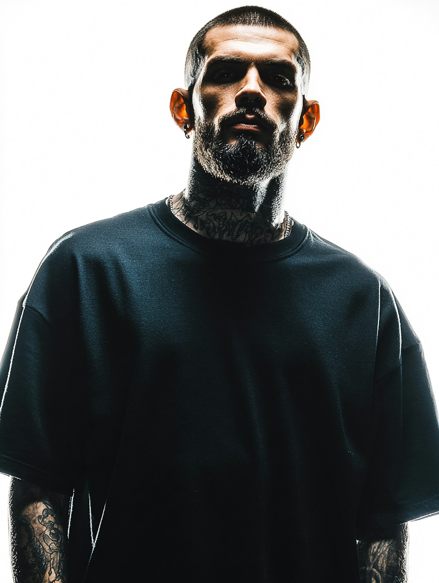 A man with tattoos and a beard in a black t-shirt, standing against a bright white background with dramatic lighting.