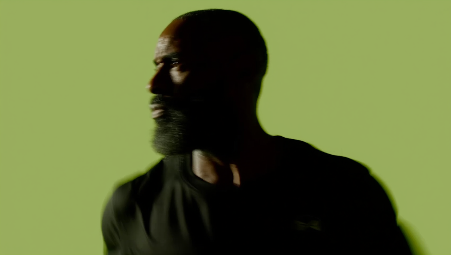 A man with a beard in a black shirt is captured in profile against a green background, creating a striking and dynamic composition.