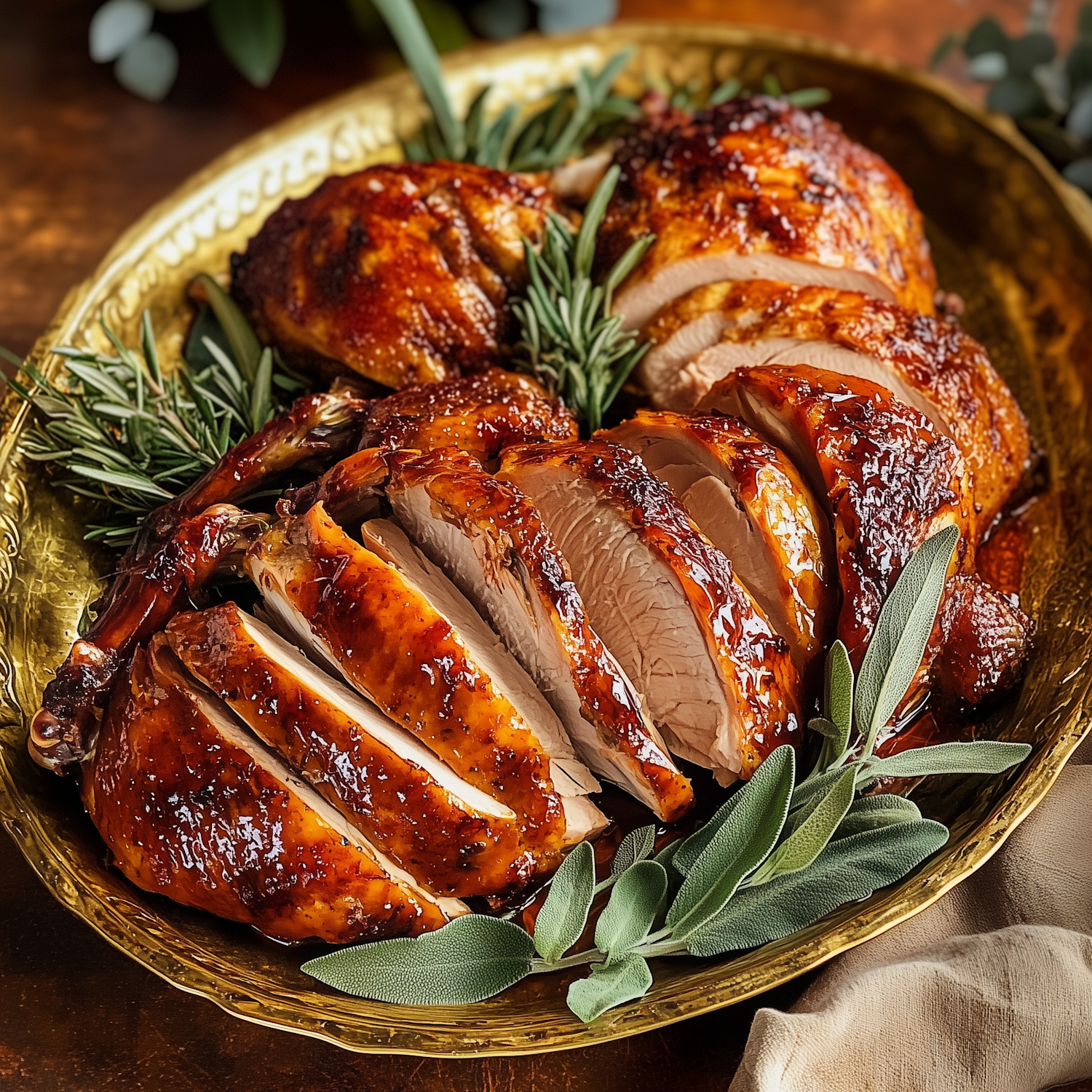 Succulent roasted turkey with crispy skin, garnished with rosemary and sage on a golden platter, perfect for festive occasions.