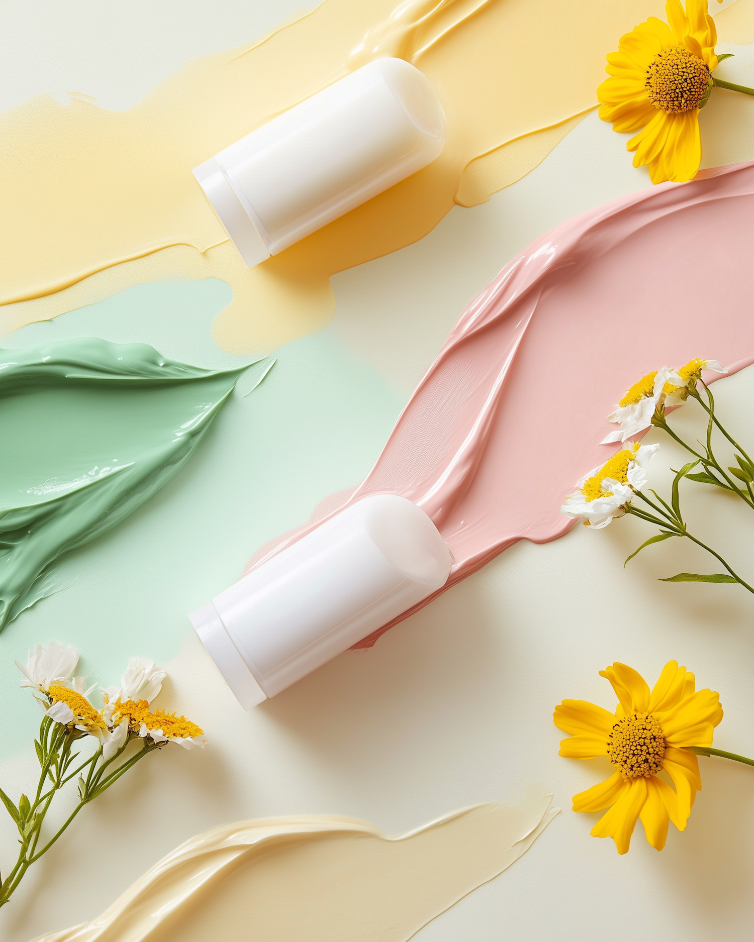 Elegant skincare products with pastel creams and vibrant flowers create a fresh, calming aesthetic.