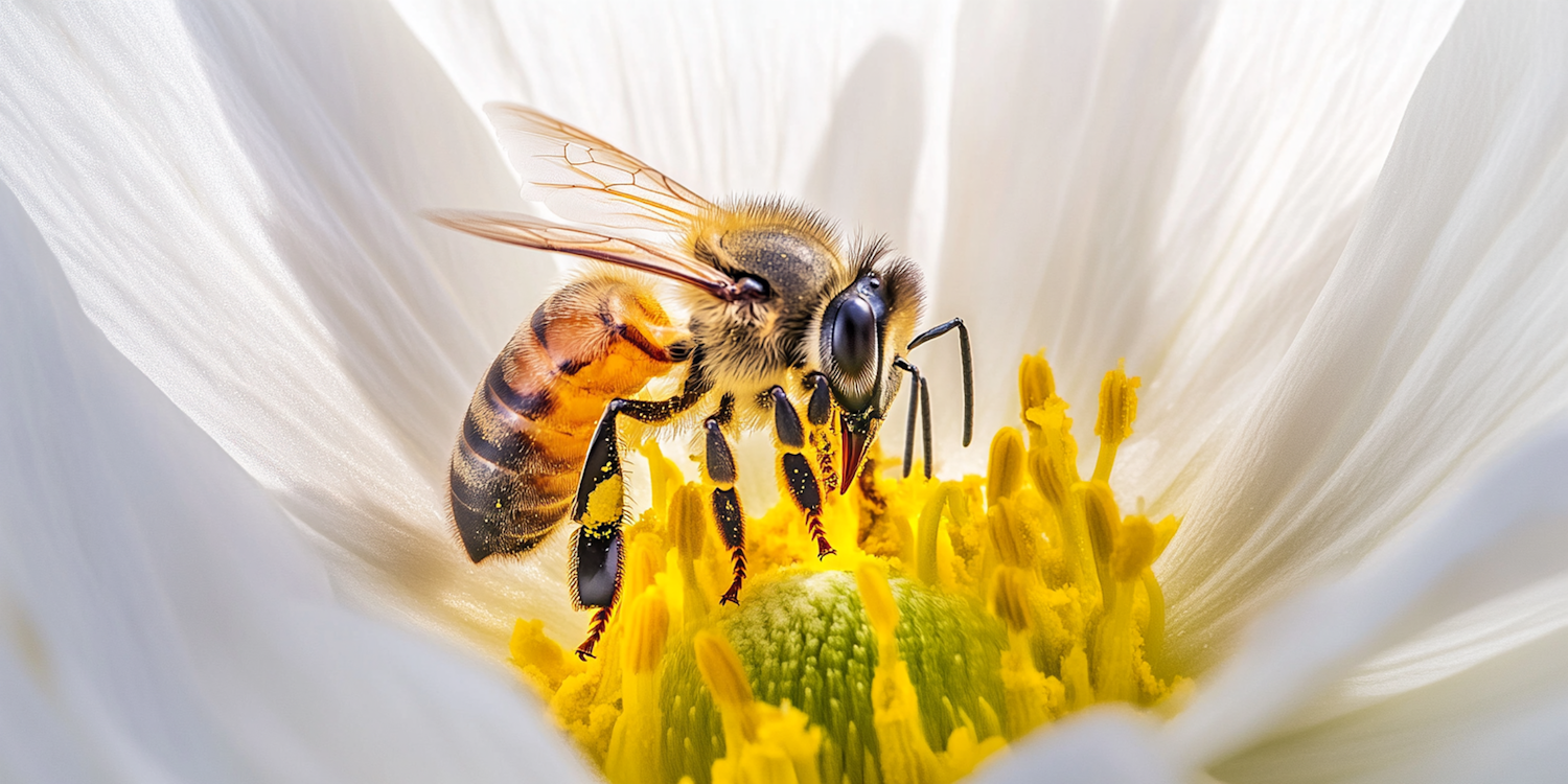 Close-up of a bee collecting pollen from a white flower with a vibrant yellow center, showcasing intricate details and textures.