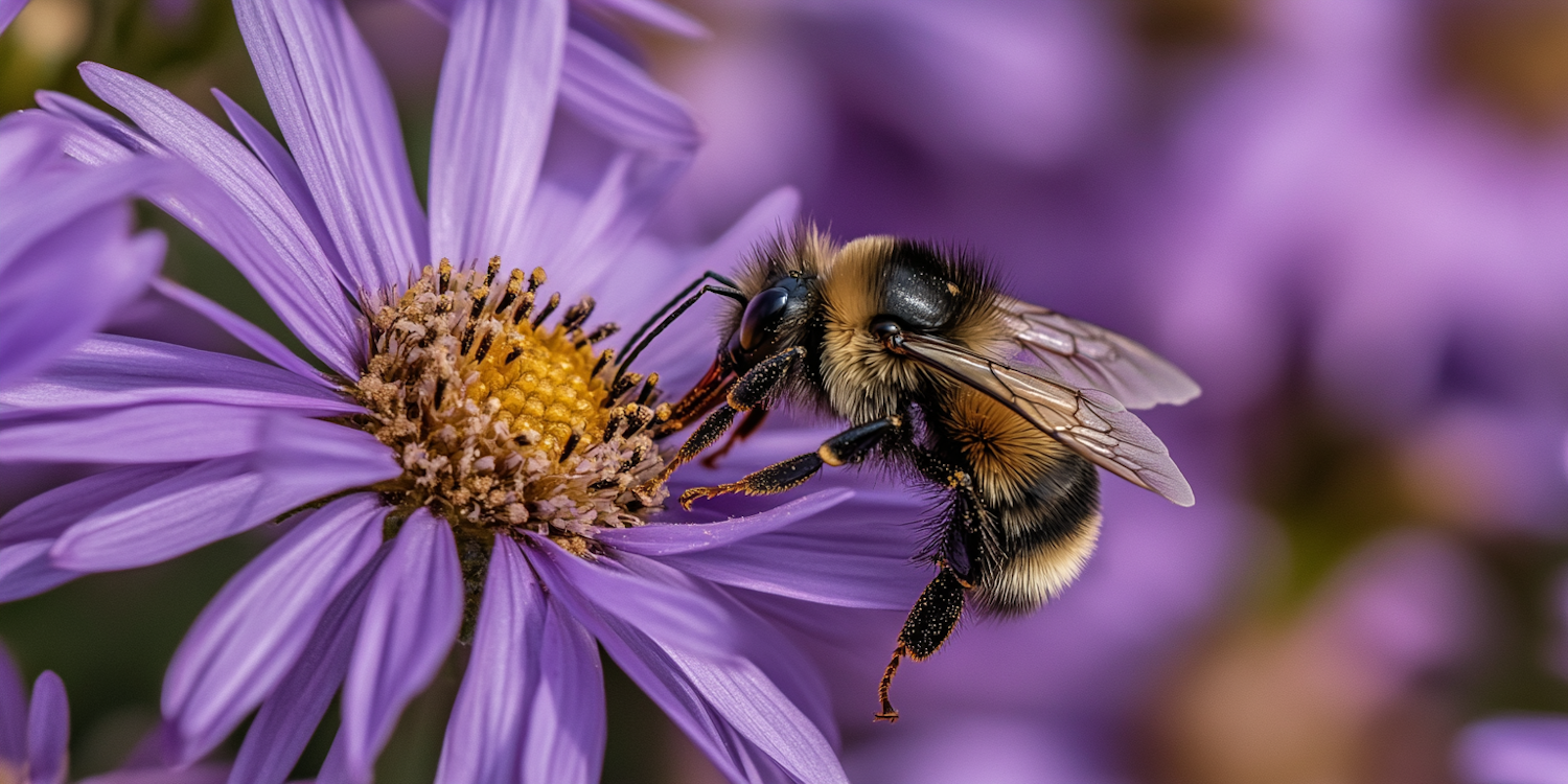 Close-up of a bumblebee on a purple flower, showcasing its fuzzy body and delicate wings against a blurred background.