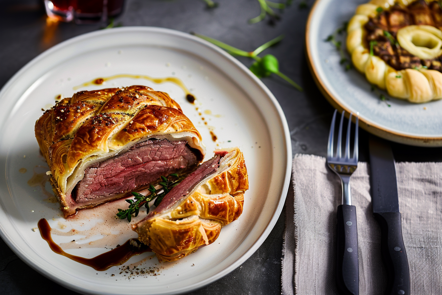 Delicious Beef Wellington with golden pastry and medium-rare beef, garnished with thyme and sauce. Elegant dining setup.