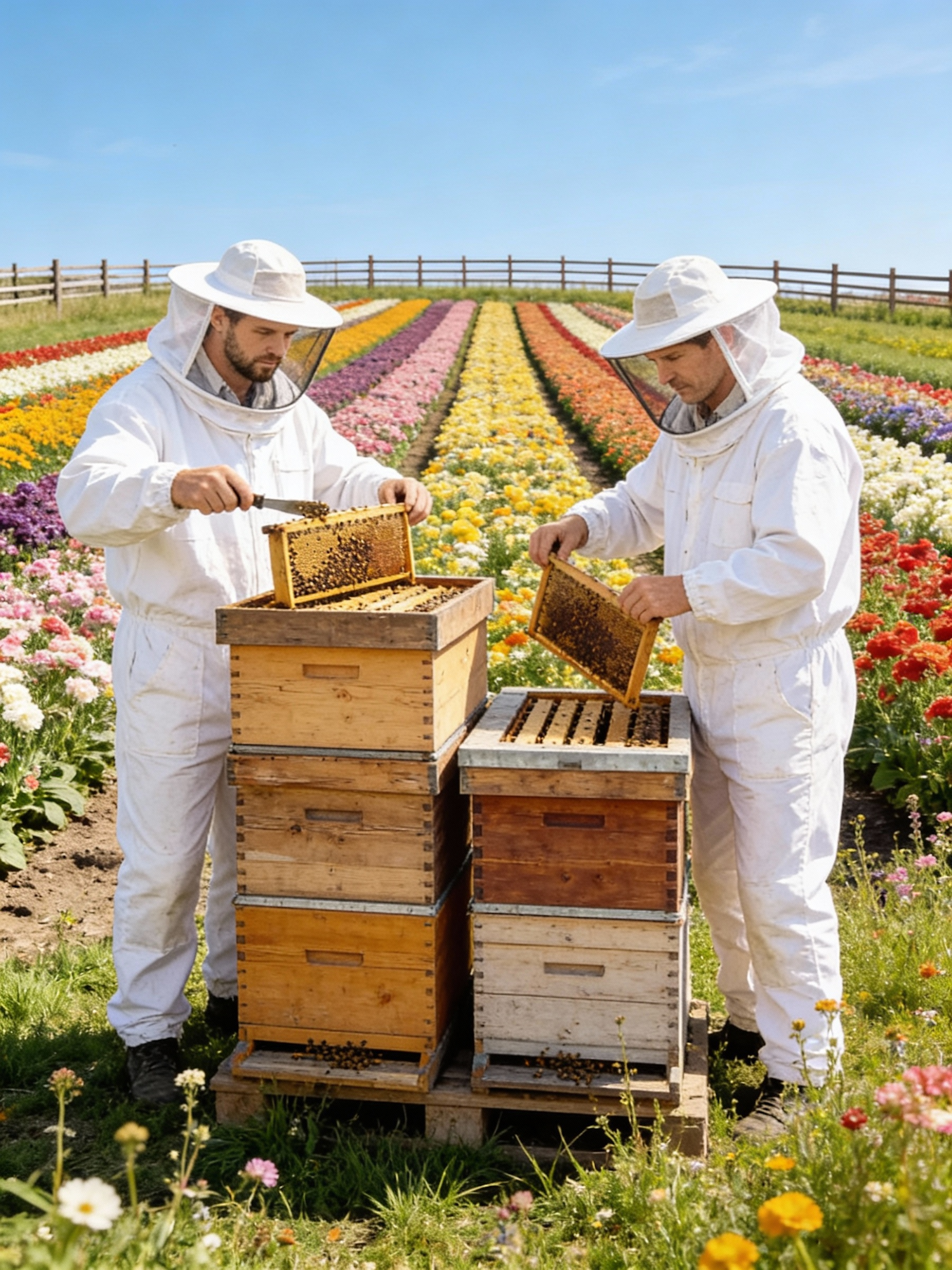 Two beekeepers in protective suits inspect honeycombs in a colorful flower field under a bright blue sky.