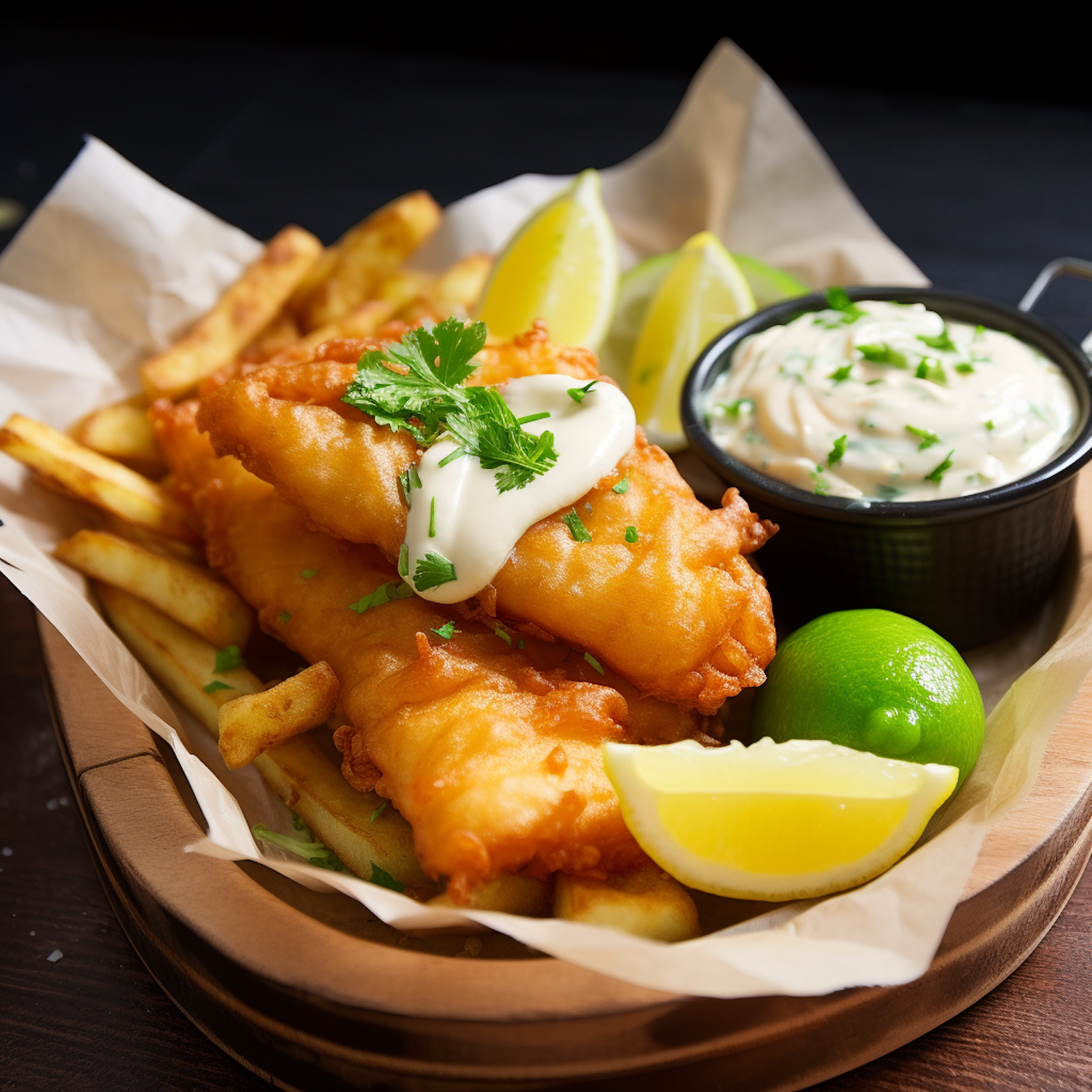Golden fish and chips with tartar sauce, lemon wedges, and fresh herbs on a wooden platter.