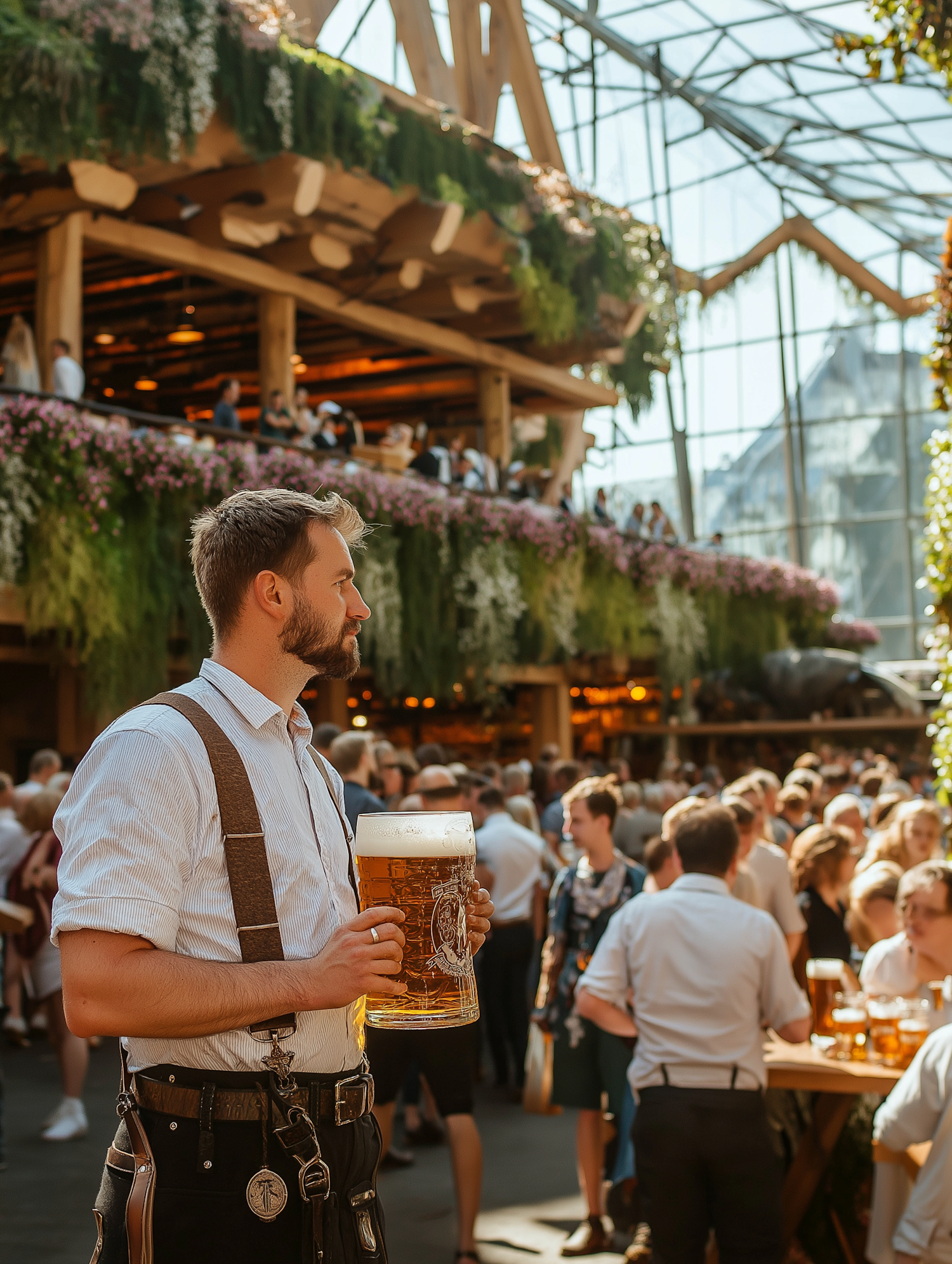 Man in lederhosen holding a beer mug in a lively beer hall with a wooden, flower-adorned interior.