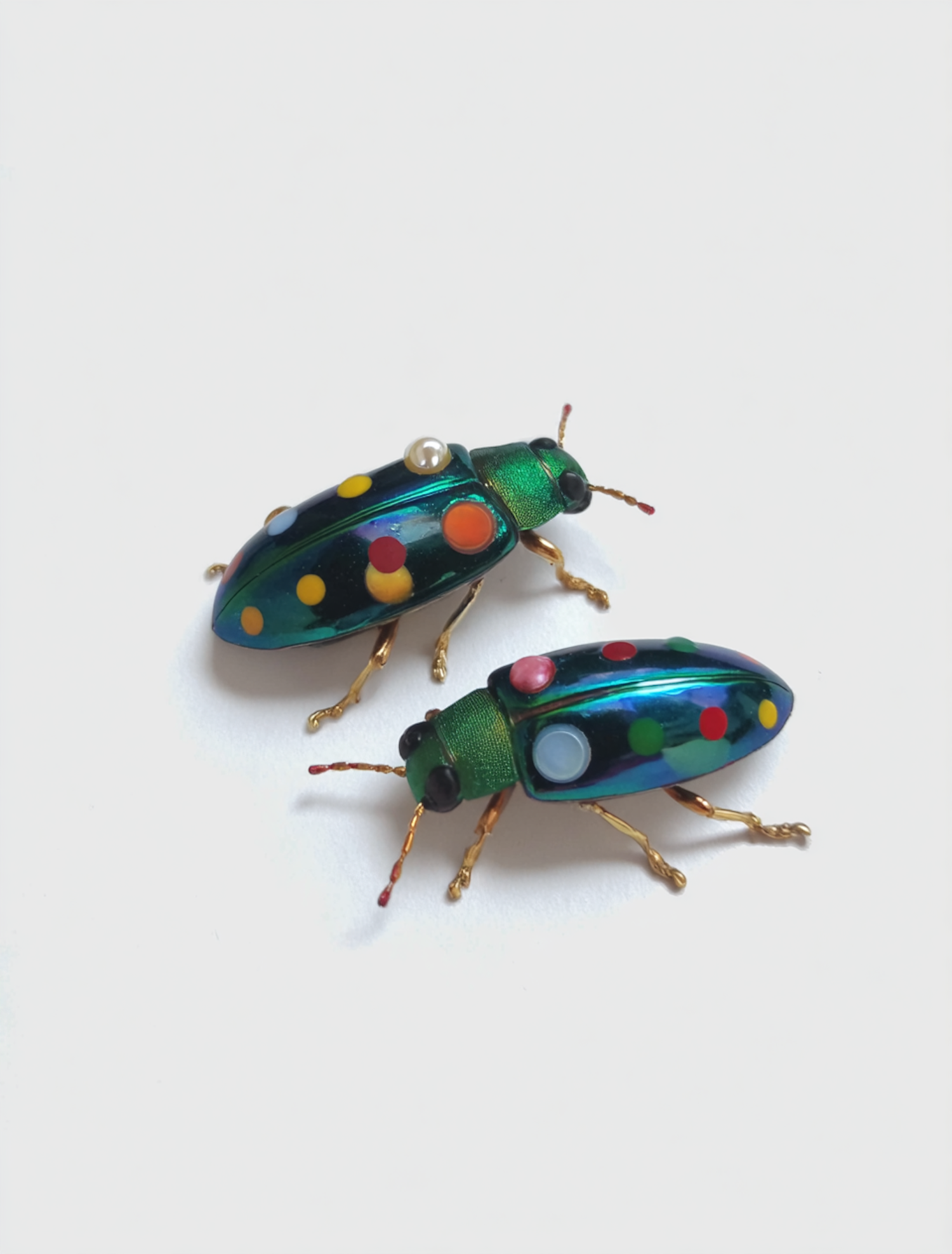 Two colorful beetle-shaped brooches with metallic green finish and polka dots, displayed on a white background.