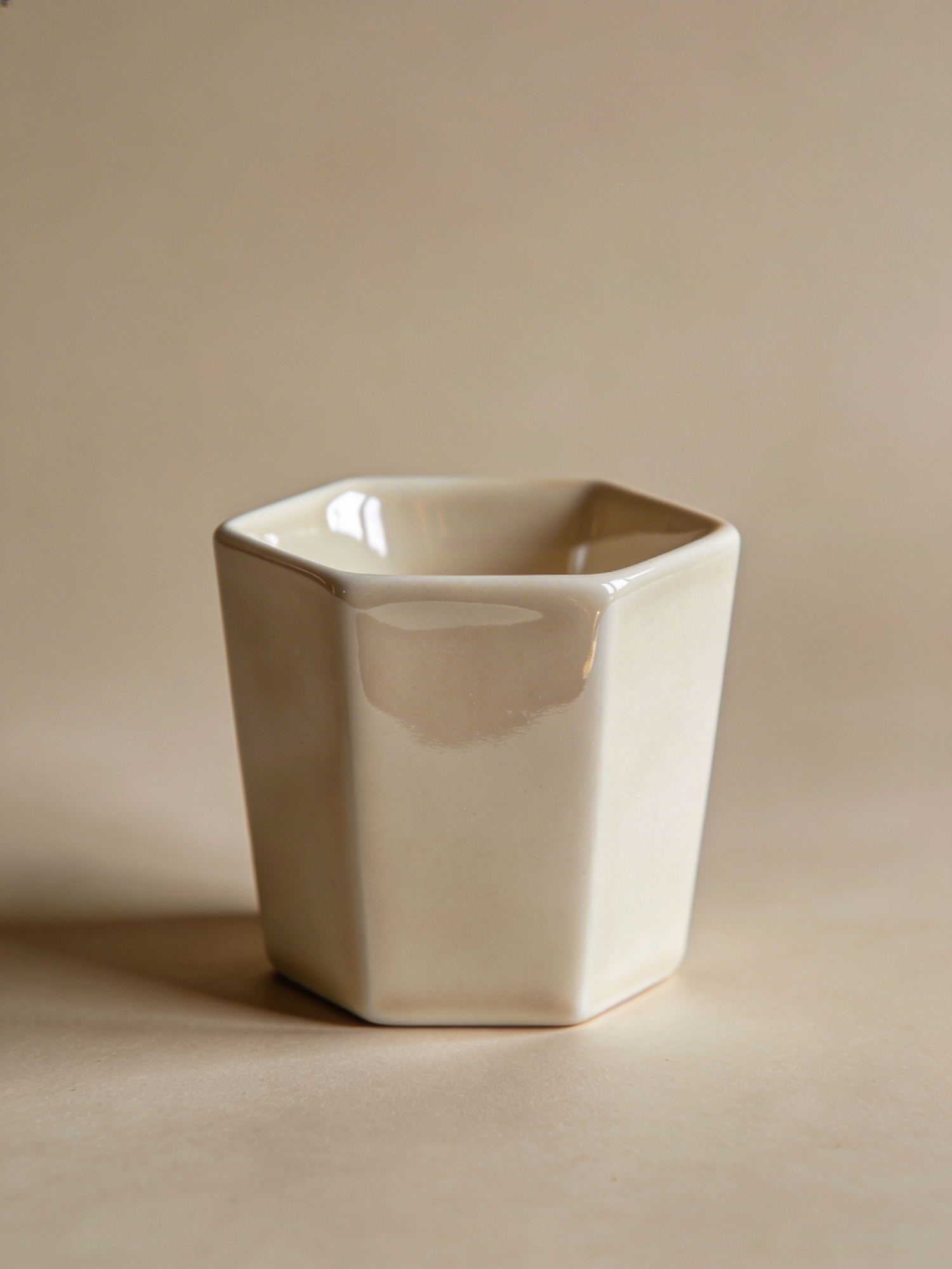 Minimalist hexagonal beige ceramic cup on a matching background, showcasing its glossy finish and clean design.