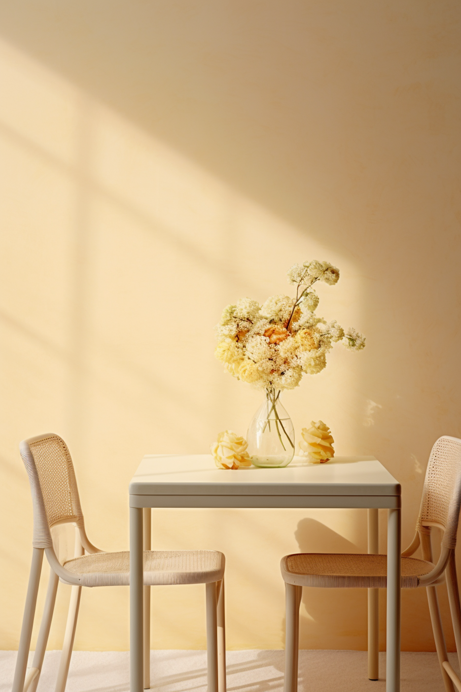Minimalist table setting with a vase of flowers, two chairs, and warm sunlight casting shadows on a soft yellow wall.