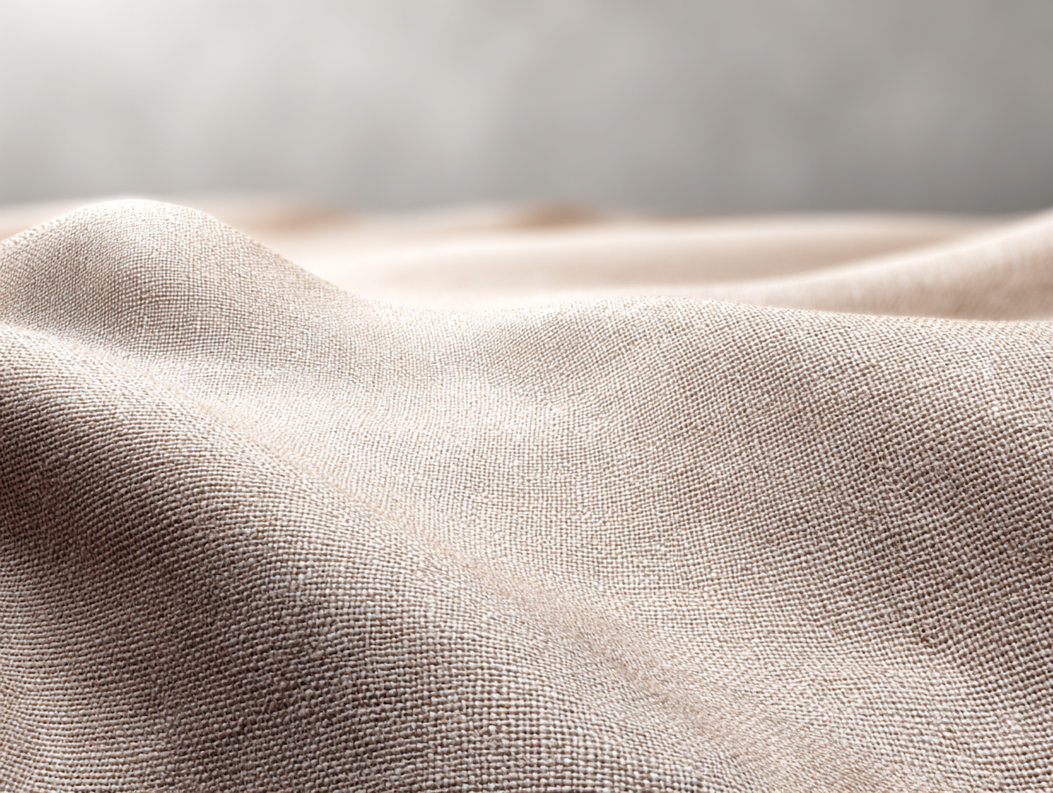 Close-up of beige fabric with detailed texture and soft folds, highlighting its weave and natural drape under gentle lighting.