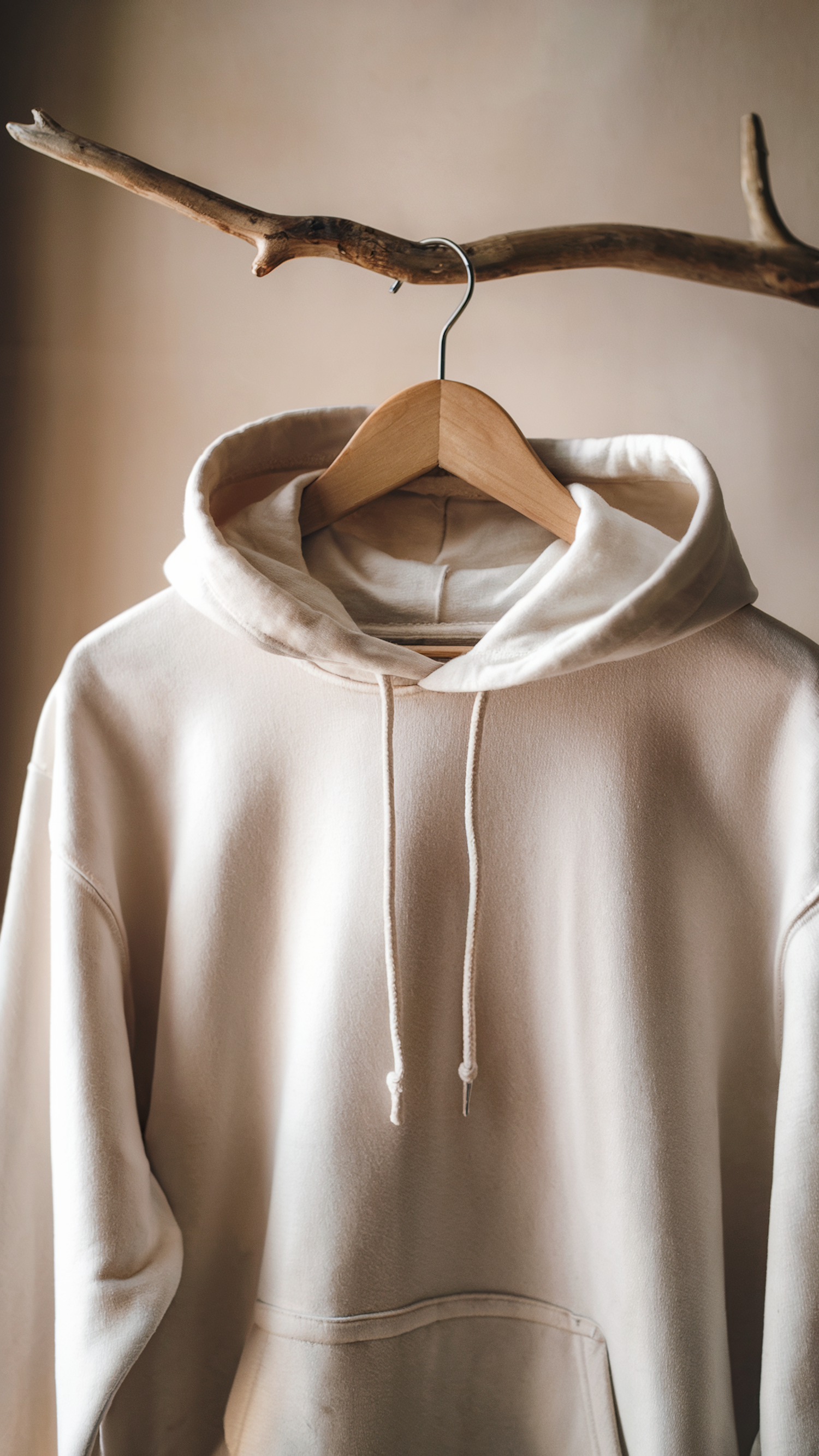 Beige hoodie on a wooden hanger, suspended from a rustic branch, with soft lighting and a minimalist aesthetic.