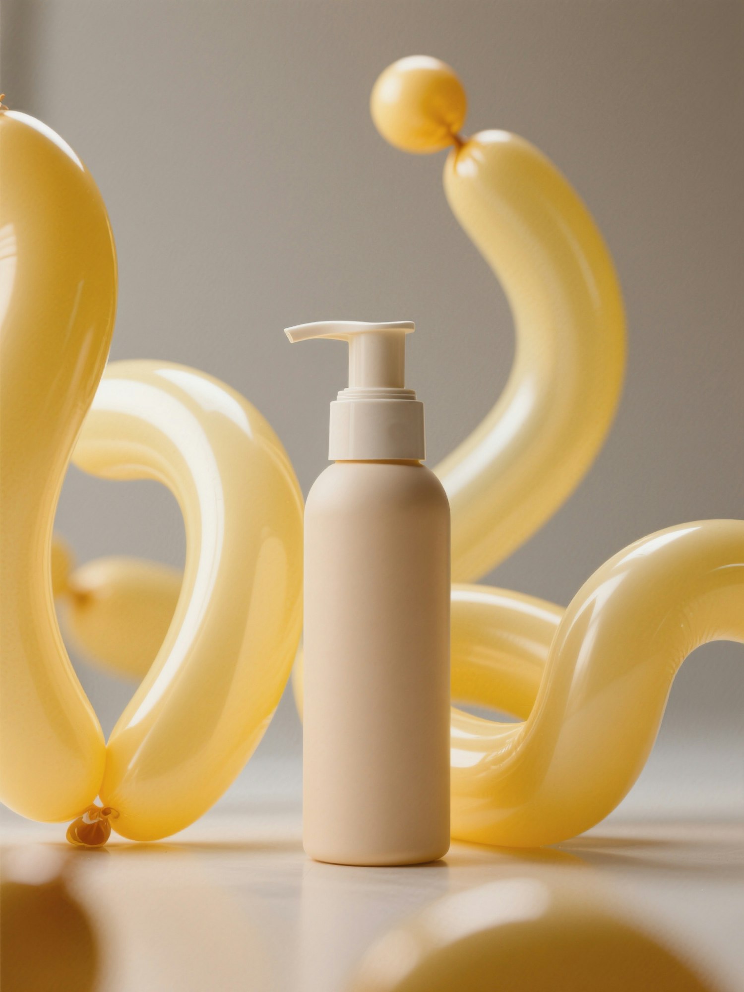 high-end studio shot of a blank cosmetic product with no branding, no label, no text — surrounded by glossy inflated shapes in soft or bold tones, surreal and playful composition, soft shadows, bold lighting, modern editorial look — soft beige pump bottle placed vertically in the middle of large inflated light yellow shapes, warm light and soft shadows
