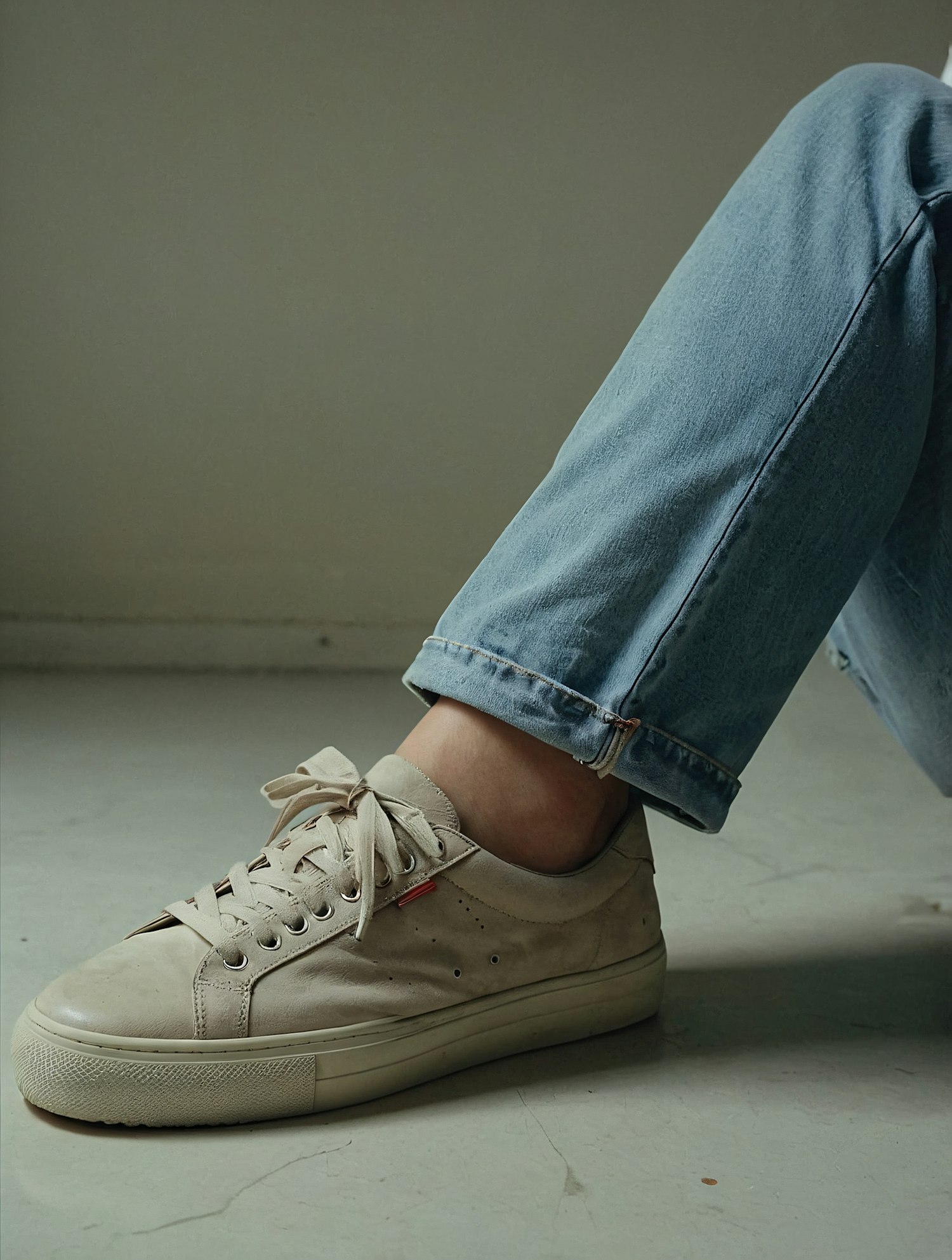 Close-up of beige sneakers with red tag detail paired with light blue jeans, set against a muted green background.