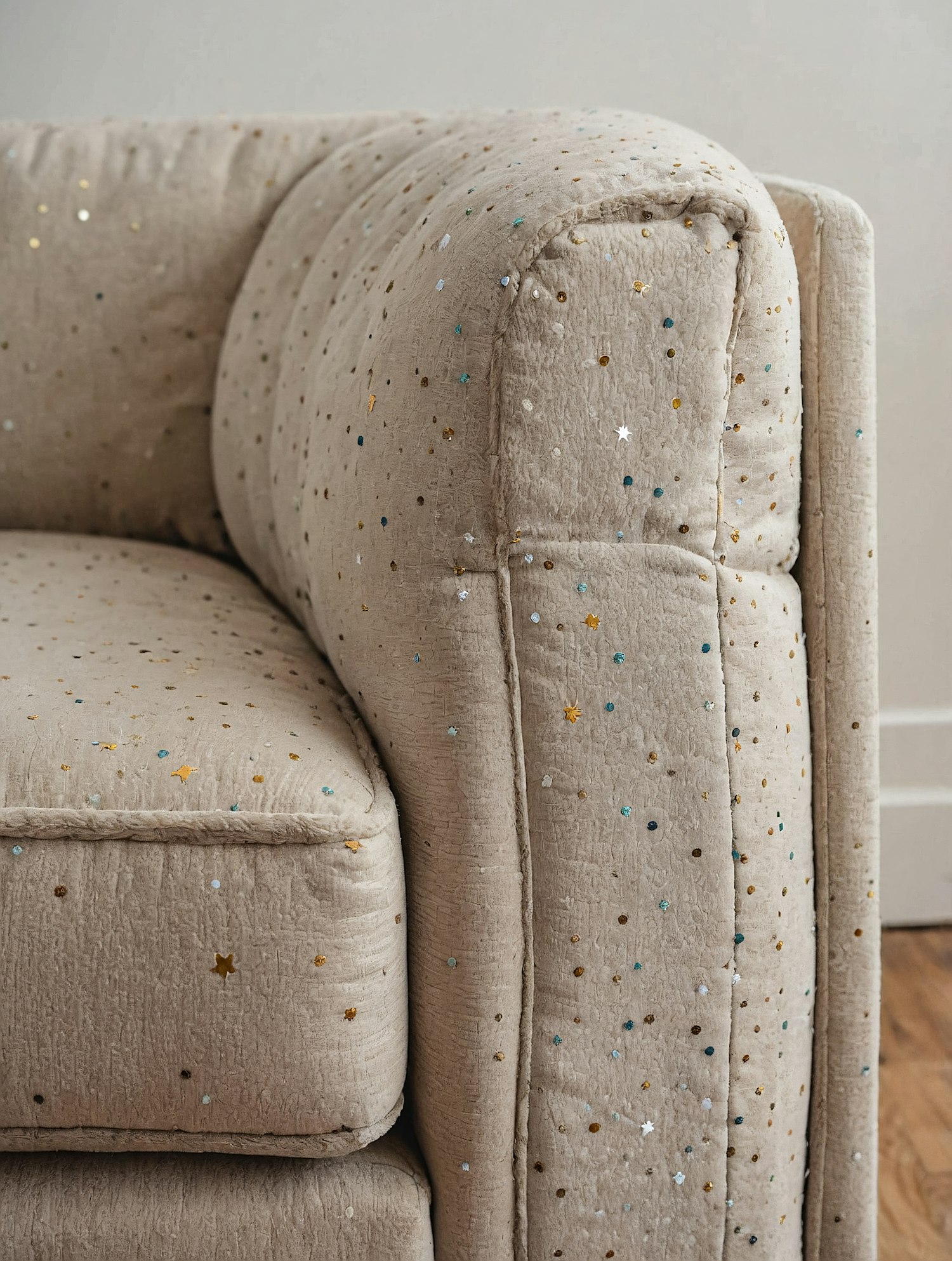 Beige sofa with textured fabric featuring metallic star and dot patterns, adding a whimsical touch to its neutral design.