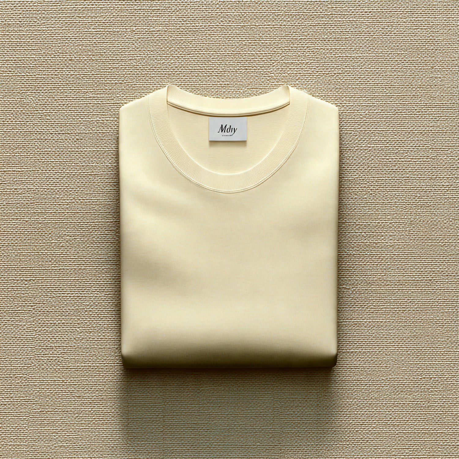 A neatly folded beige t-shirt with a round neckline and visible label, placed on a textured beige surface for a minimalistic look.