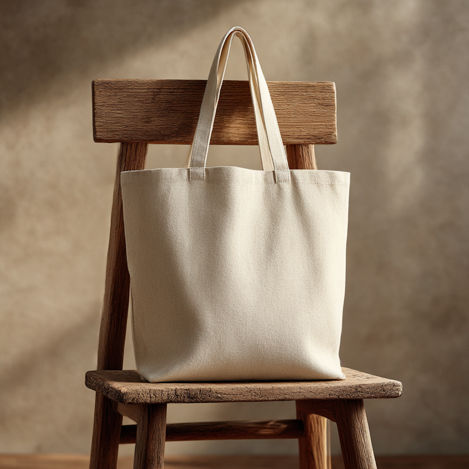 A beige canvas tote bag on a rustic wooden chair, set against a softly lit neutral background, showcasing simplicity and natural textures.