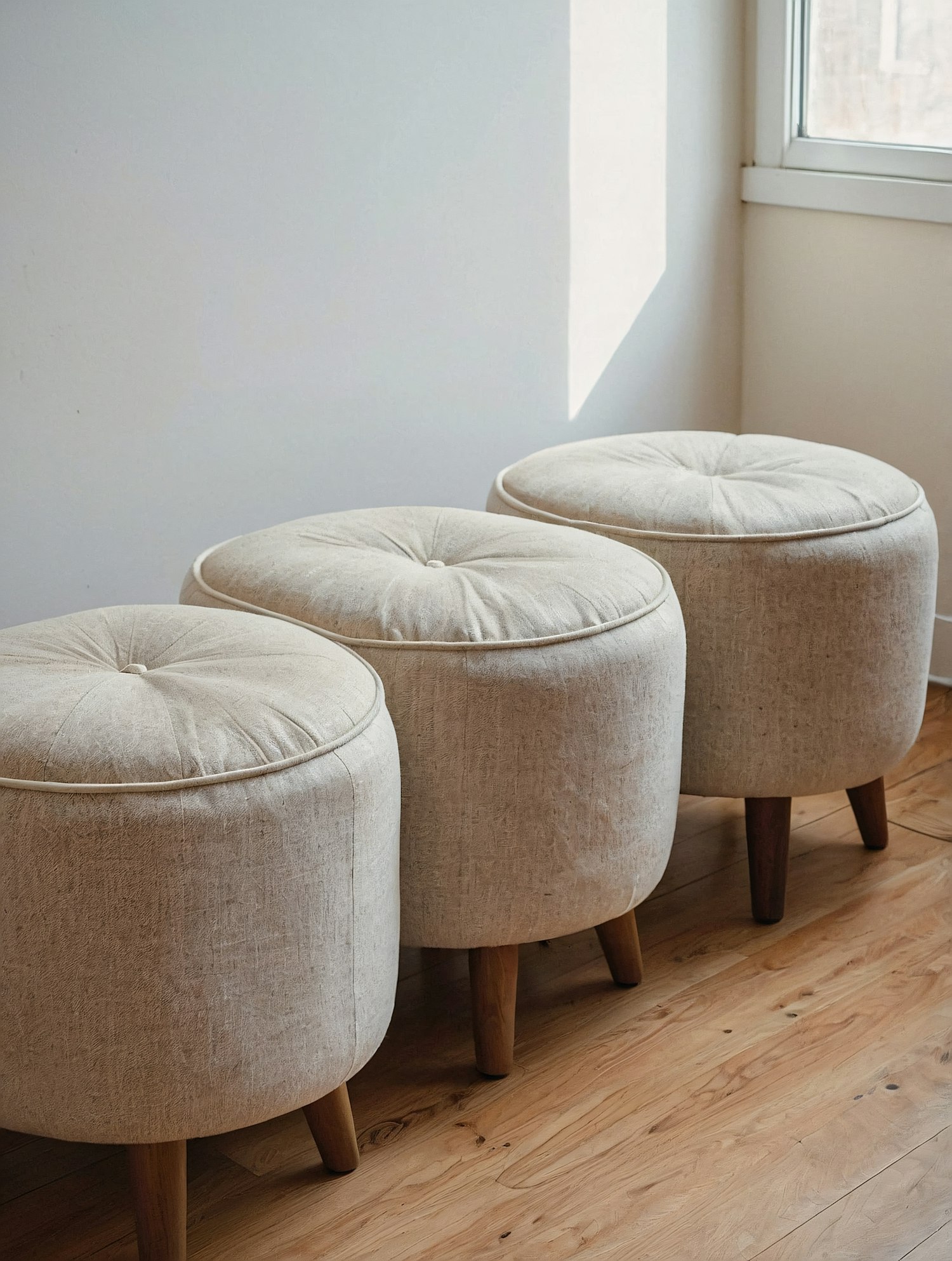 Three beige tufted ottomans with wooden legs arranged on a light wooden floor, bathed in natural light from a nearby window.