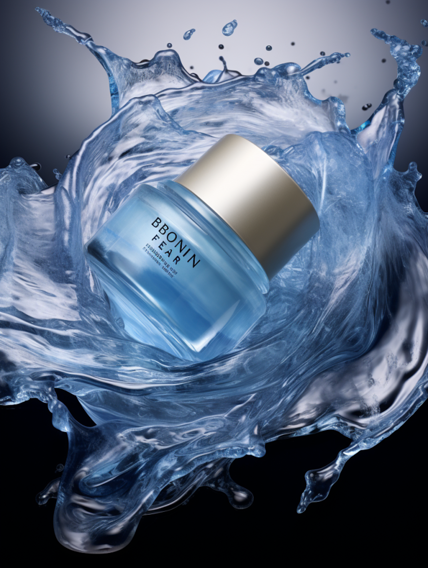 Luxurious blue jar with golden lid surrounded by dynamic water splash, conveying freshness and elegance in a high-end cosmetic ad.