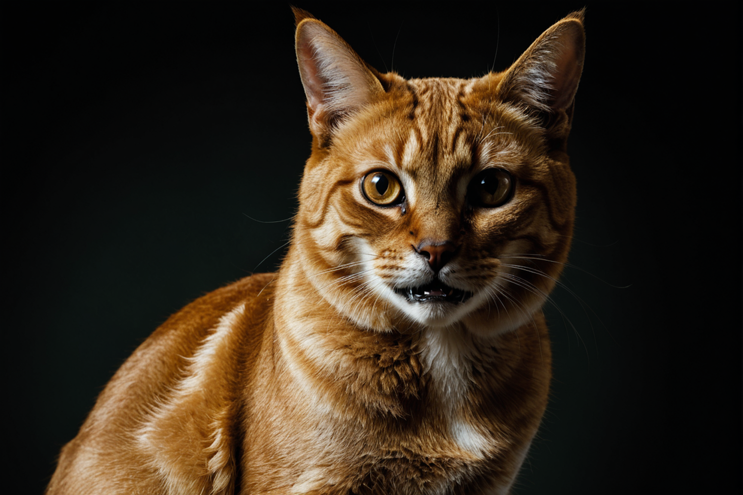 Close-up of a Bengal cat with vivid orange fur and striking amber eyes, set against a dark background for a dramatic effect.