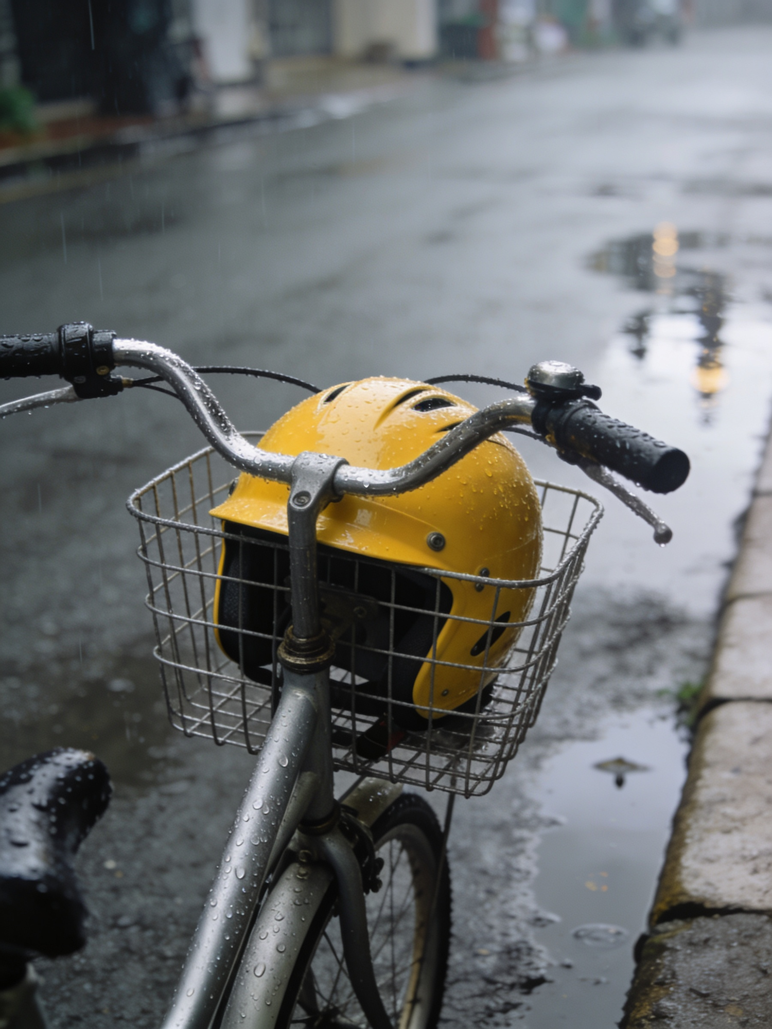 A bicycle with a yellow helmet in its basket, parked on a rainy street with visible raindrops and puddles reflecting light.