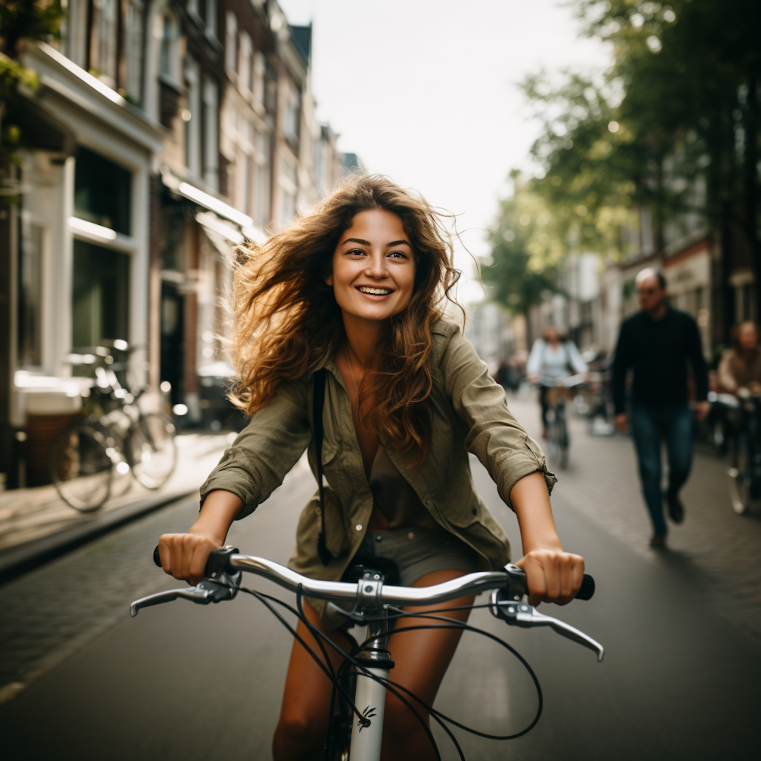 Joyful woman with wavy hair cycling through a lively city street, surrounded by traditional buildings and fellow cyclists.