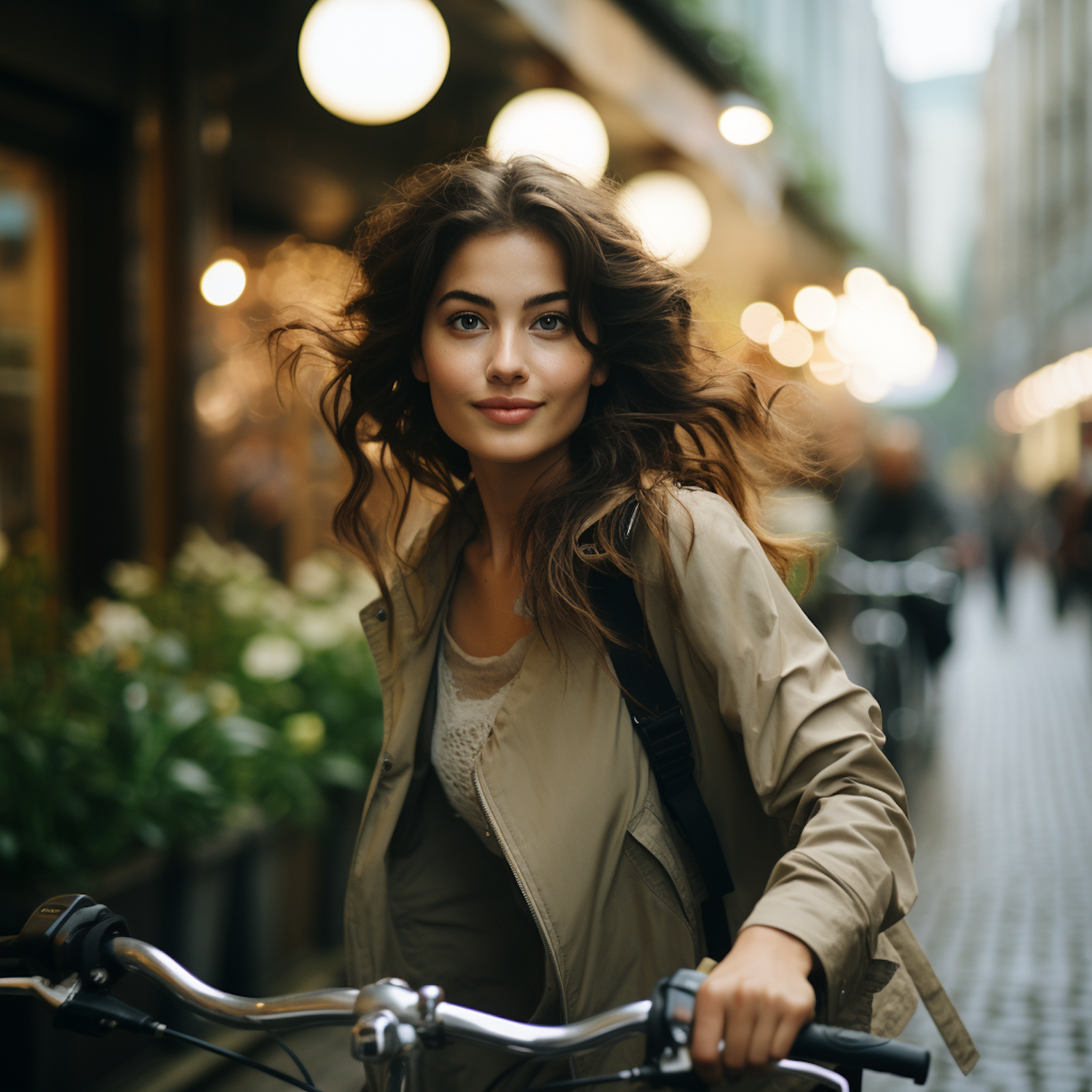 Young woman with wavy hair rides a bike on a cobblestone street, surrounded by warm lights and greenery, exuding confidence and joy.