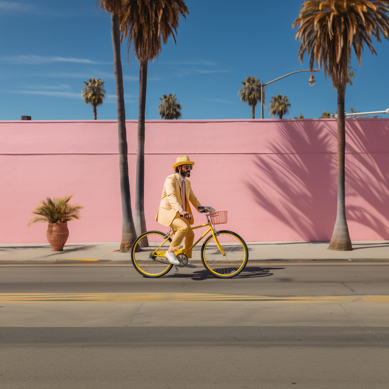 Stylish man in a pastel yellow suit rides a yellow bike past a pink wall with palm trees. Vibrant and sunny street scene.