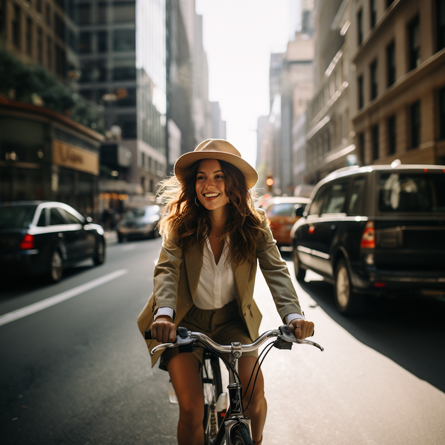 Joyful woman cycling through a bustling city street, wearing a stylish hat and blazer, with sunlight casting a warm glow.