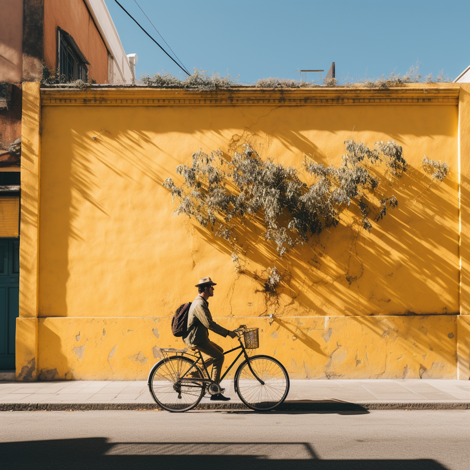 Man cycling past a vibrant yellow wall with climbing plants, under a clear blue sky. Casual attire and a relaxed atmosphere.