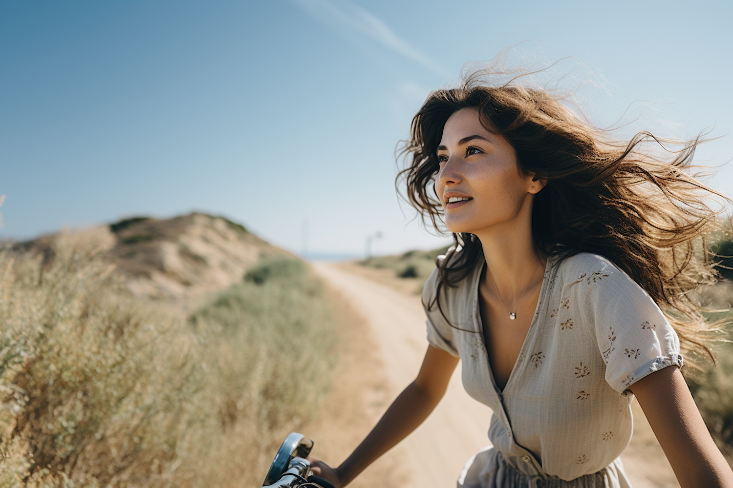 Young woman joyfully cycling on a sandy path under a clear blue sky, surrounded by dunes and sparse vegetation.