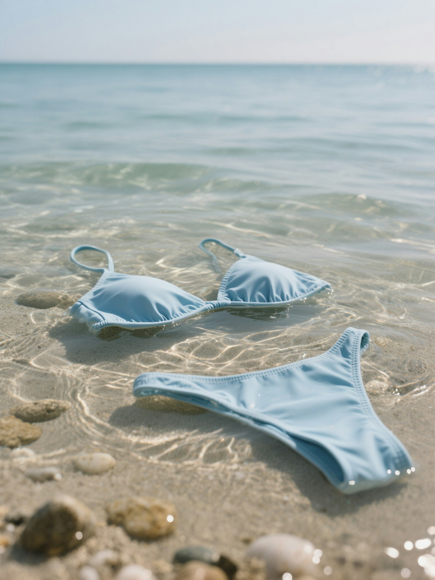 Light blue bikini on a sandy beach with clear water and sunlight reflections, evoking a serene and summery coastal vibe.