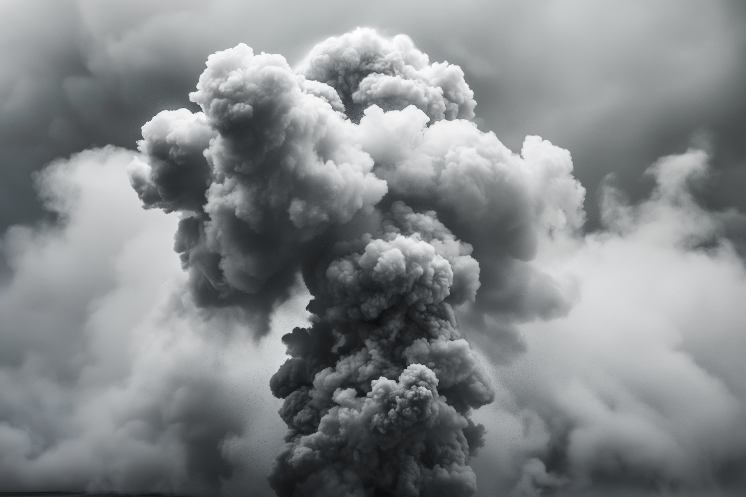 Dramatic dark gray smoke cloud rising against lighter clouds, showcasing intense movement and texture.