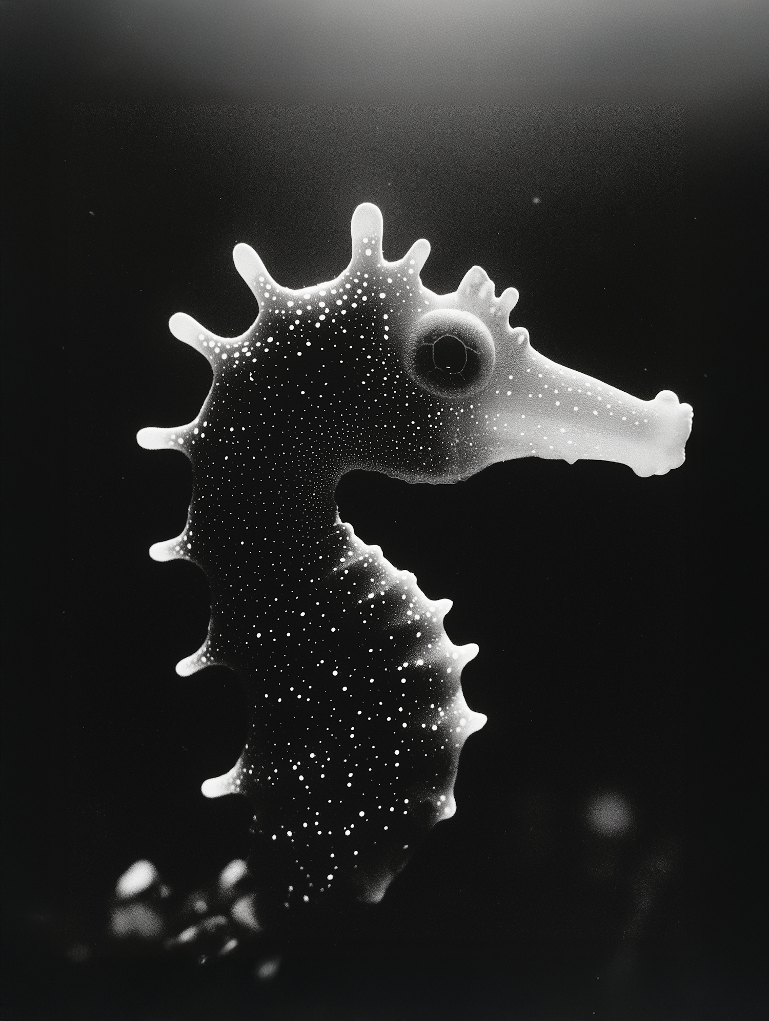 A glowing seahorse with intricate dot patterns floats against a black background, creating a surreal and luminous underwater vibe.