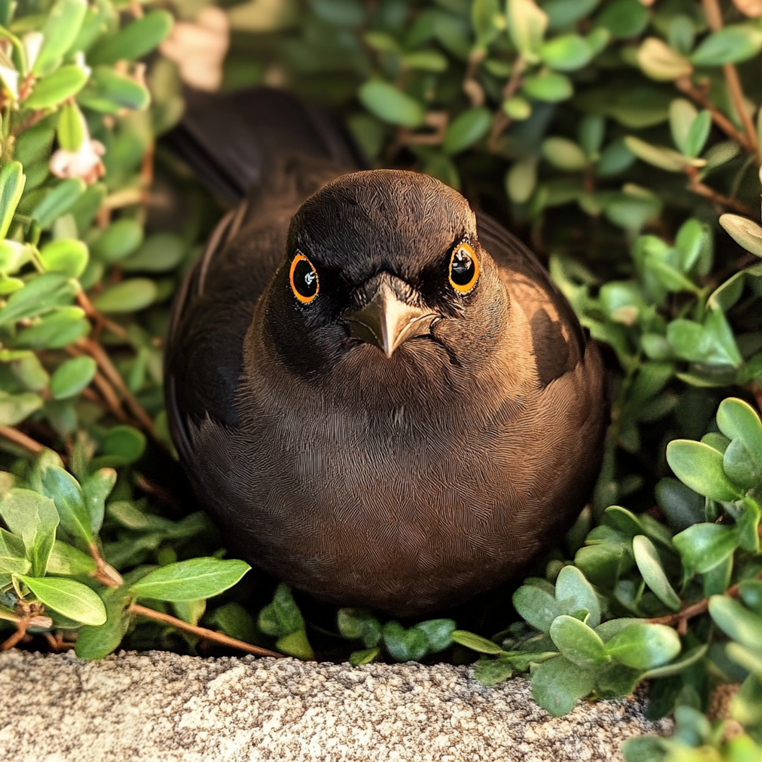 Close-up of a dark-feathered bird with striking orange eyes nestled among lush green leaves.